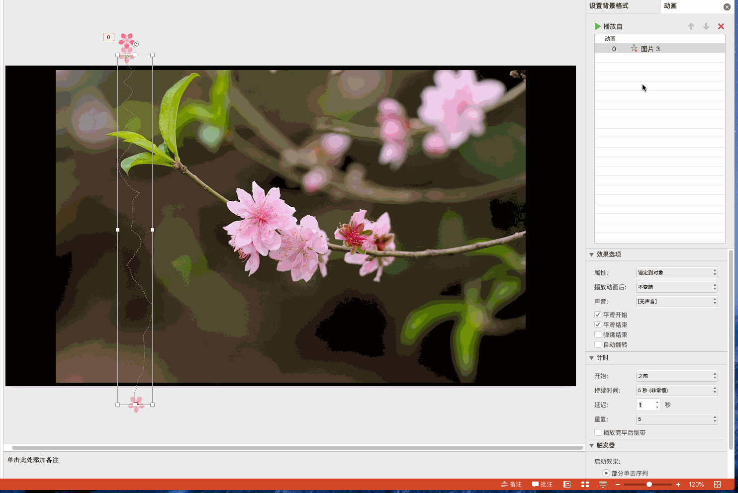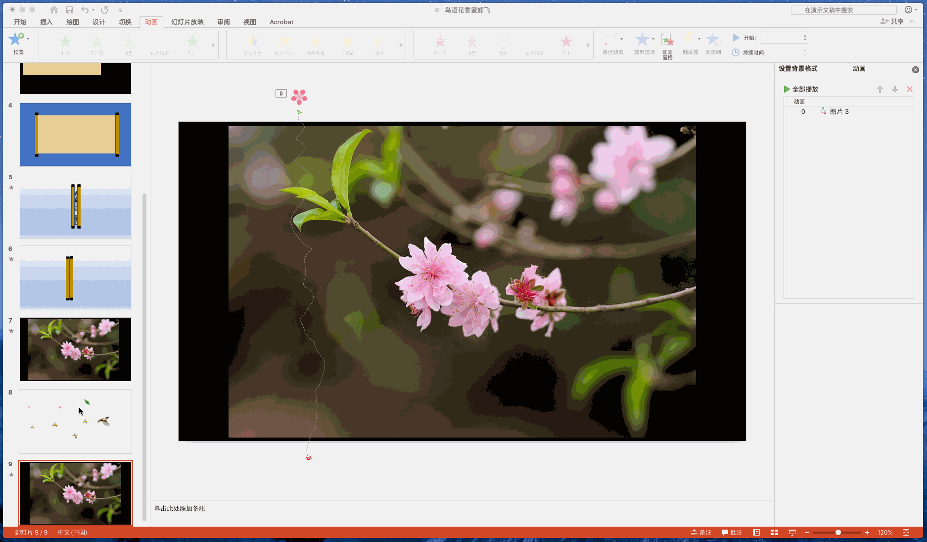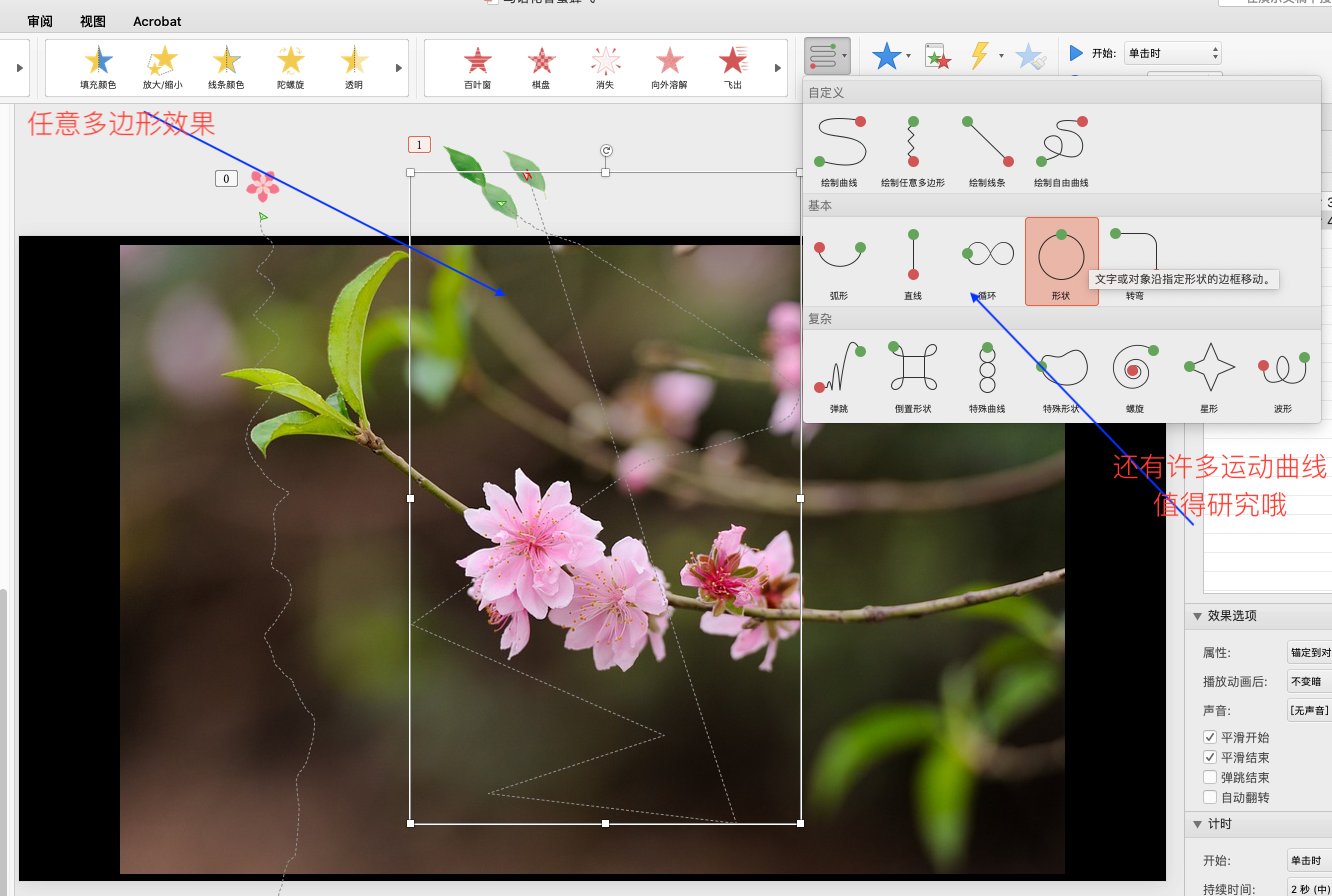 第二步,将花瓣(或鸟儿、蜜蜂)图片缩小,放到背景图片的边缘,然后点击动画,选择【路径动画】--》「绘制自由曲线」