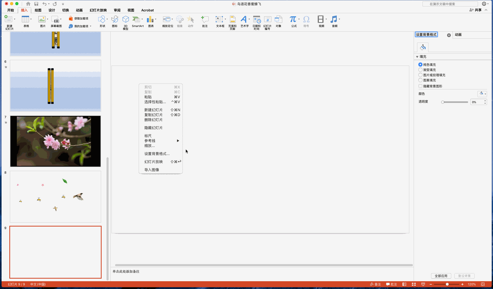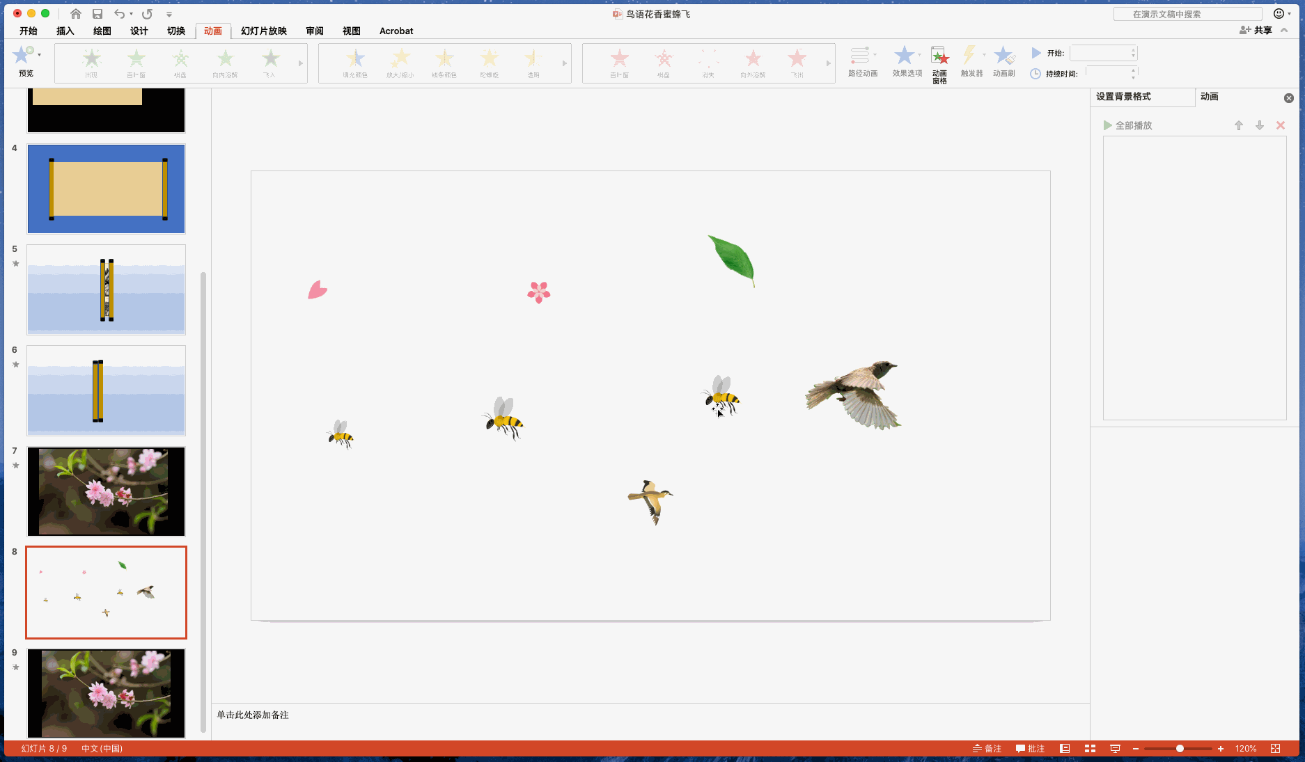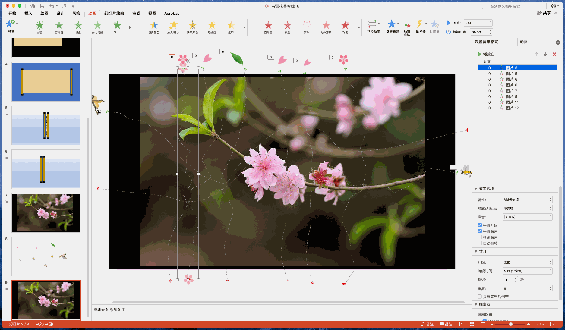 3)将花瓣、飞鸟、蜜蜂等需要移动的图片或形状,放到PPT页面边缘,分别对他们设置运动效果