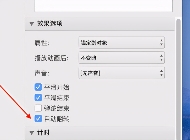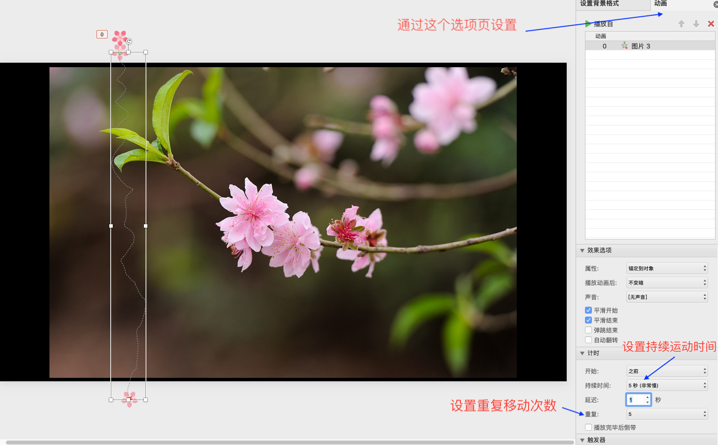 不过在动画设置里,其实还有好多功能可以用,比如这只鸟老是这样从左到右飞,是不是很单调,能不能让它飞到右边后,调头飞回来呢?答案是可以的。