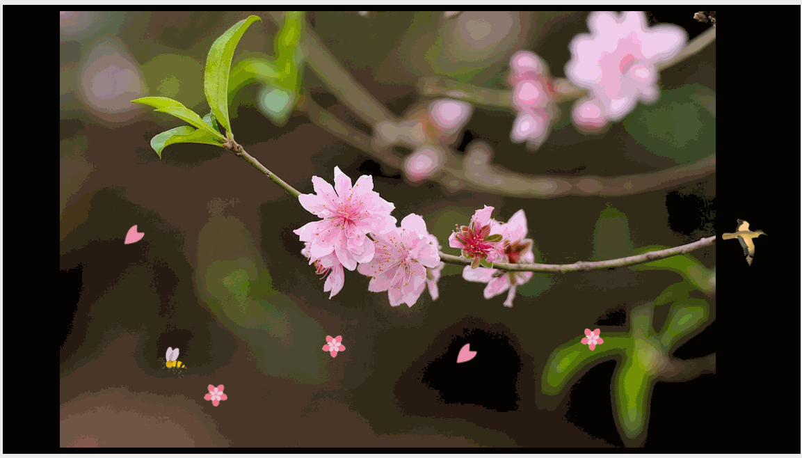 要做出这样的效果,先分析一下,就是一张桃花的背景图,加上一些花瓣、飞鸟或蜜蜂,然后让花瓣、和鸟儿、蜜蜂移动起来就行了。