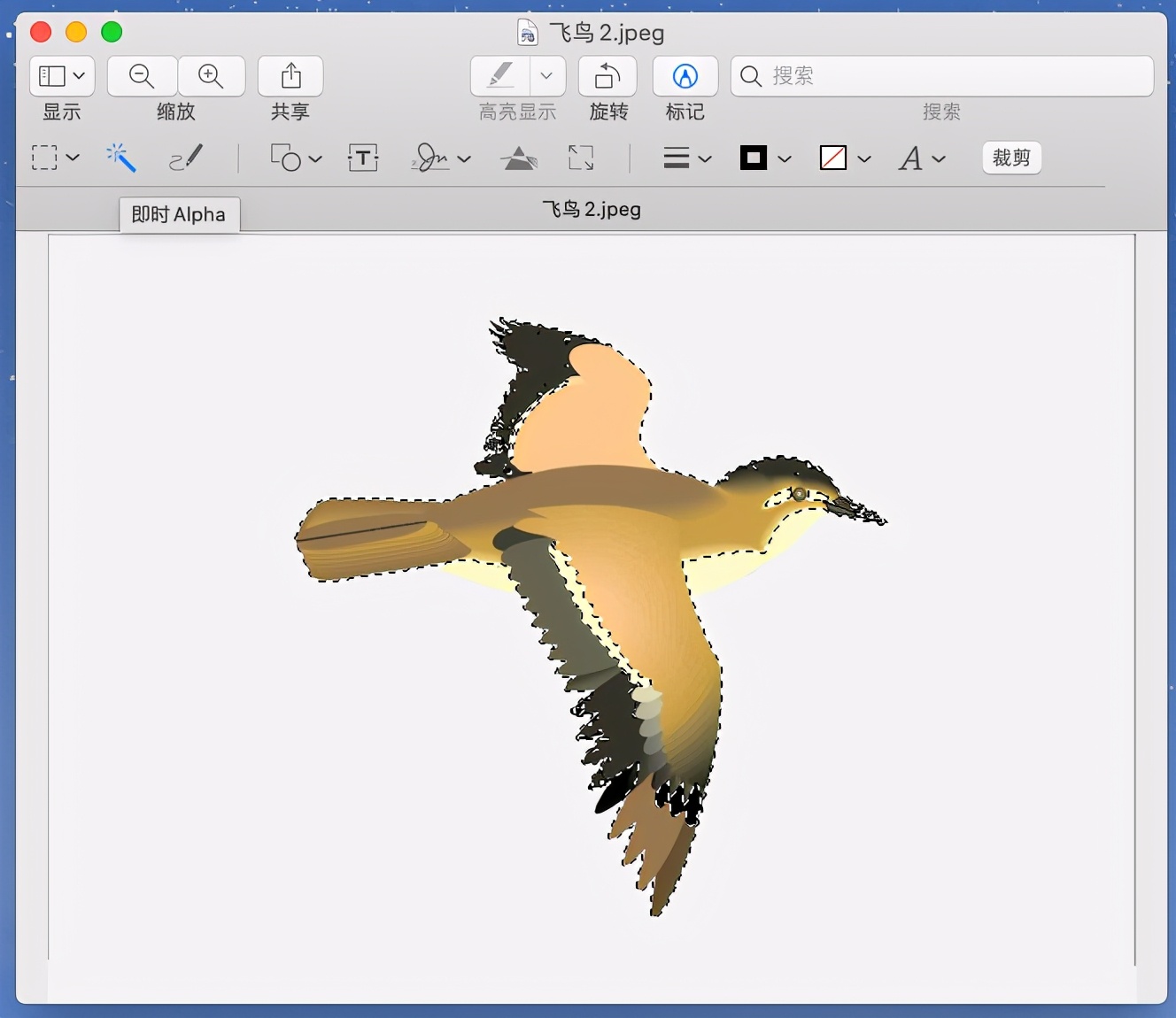 如上图,PP君就是用「预览」功能的“即时Alpha”功能将这只鸟裁剪了出来。(这里就先不展开说了,下次有空做一个教程讲解如何使用MAC中的预览功能)