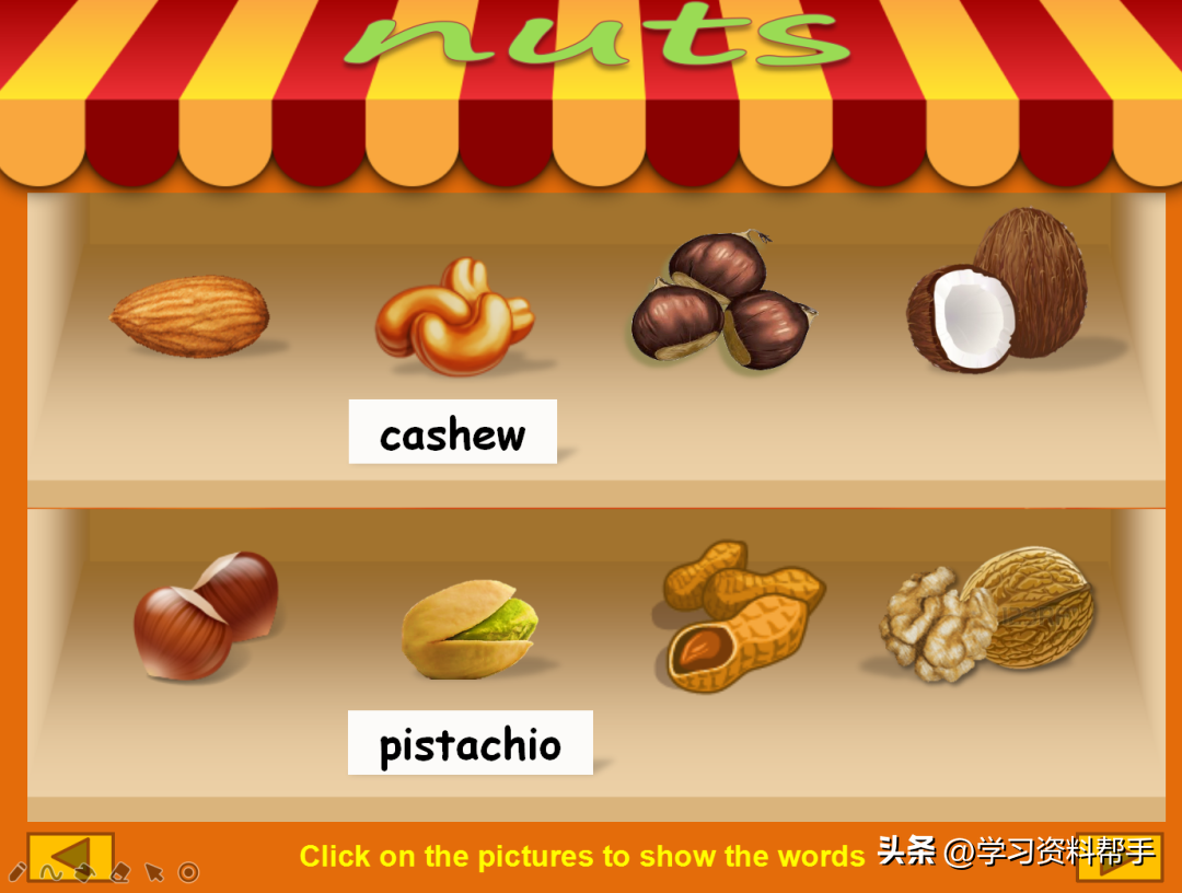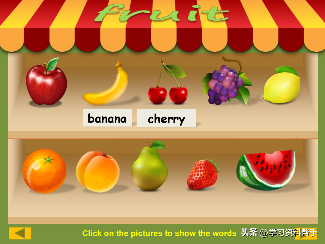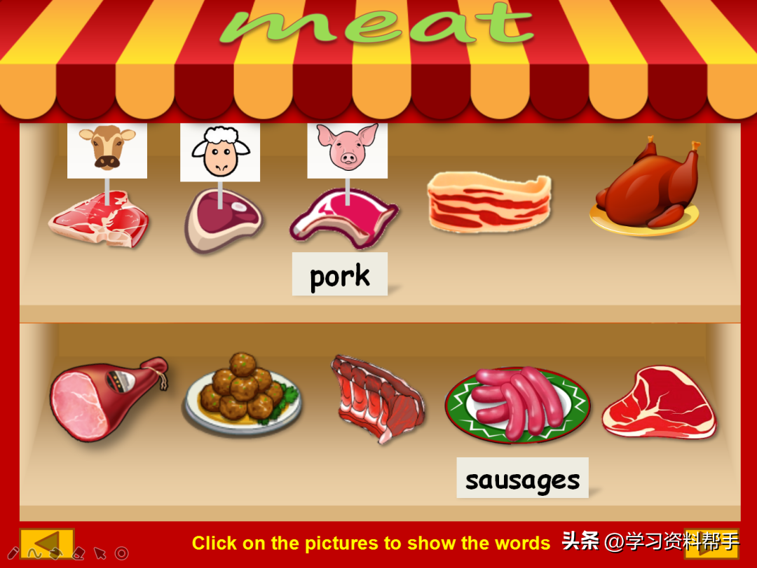 这是一个依托于超市的场景,在货架上排布着各种各样的水果、蔬菜、肉蛋奶等等,他们的英文名都是什么呢?点击就会出现哦!