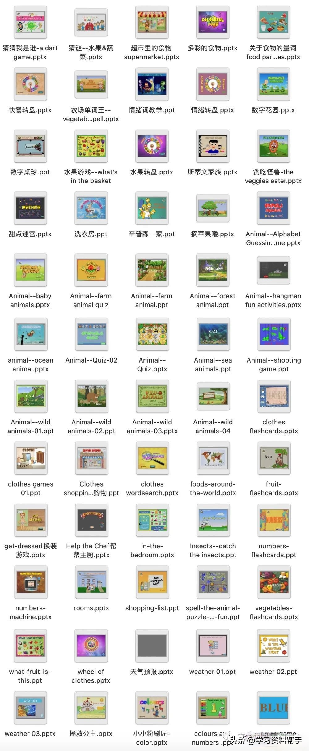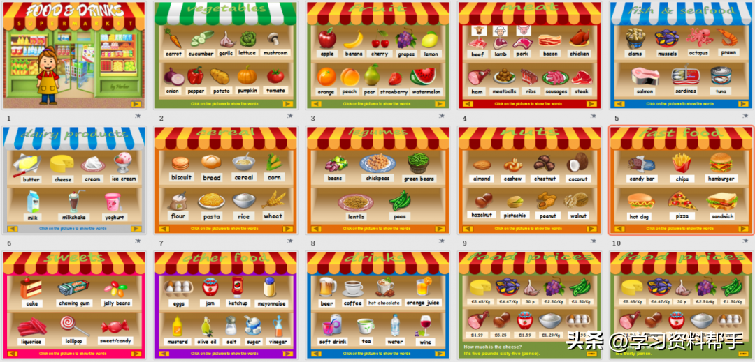 其中主题包括:食物、动物、情绪、家庭、服装、颜色、数字和天气 ,每一个PPT都很有设计感,互动性很强,知识点清晰,轻松点燃课堂气氛,激发孩子们学习兴趣~