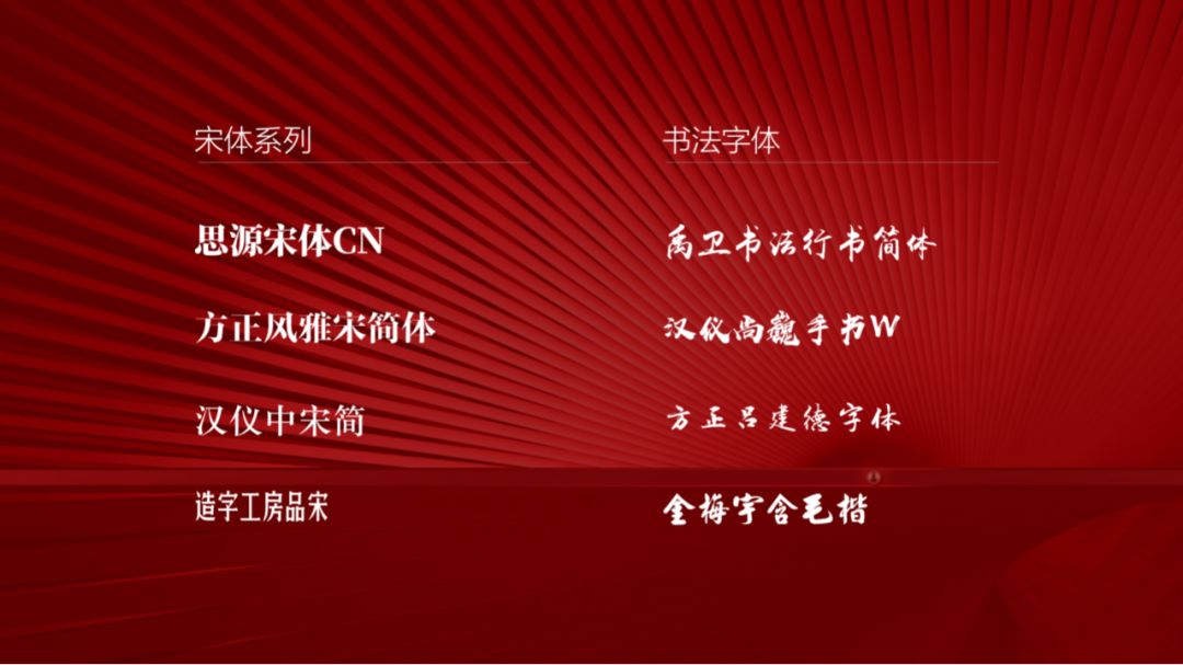 书法字体有一种豪迈的气质,而宋体是比较正式的一种字体,所以用在党政PPT中都比较适合。
