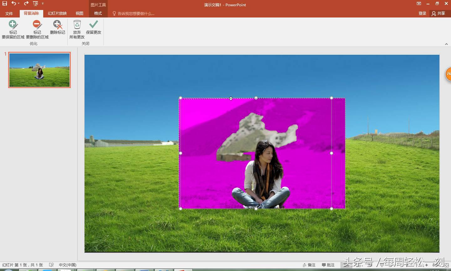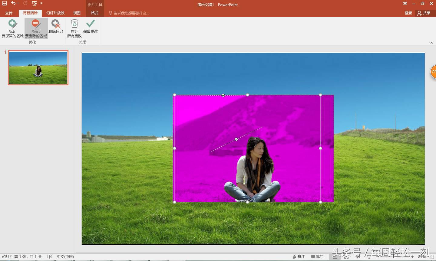 2、 选中图片,点击“格式”——“删除背景”,调整选中框的大小与图片大小一致,得到下图。下图中,紫色覆盖的部分,表示要删除的图片部分。