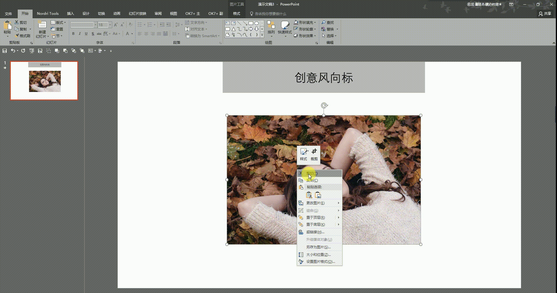 2.那有没有办法可以让插入的图片也能调节透明度呢?我们以前因为没有什么办法,要调节得到PS中去进行,其实PPT也可以做到的,一起来做下吧!我们先按照图片的大小插入一个矩形框,将轮廓设置为“无轮廓”,然后右键选择设置为“置于底层”,选中图片,剪切