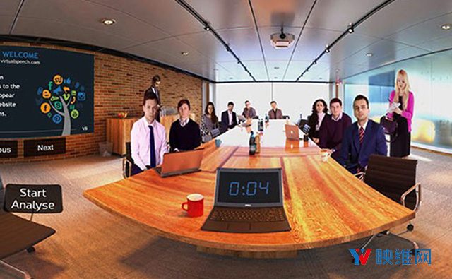 这款VR应用程序存在两个作用:1. 将用户沉浸在一个逼真的会议室环境;2. 为用户提供实时反馈。
