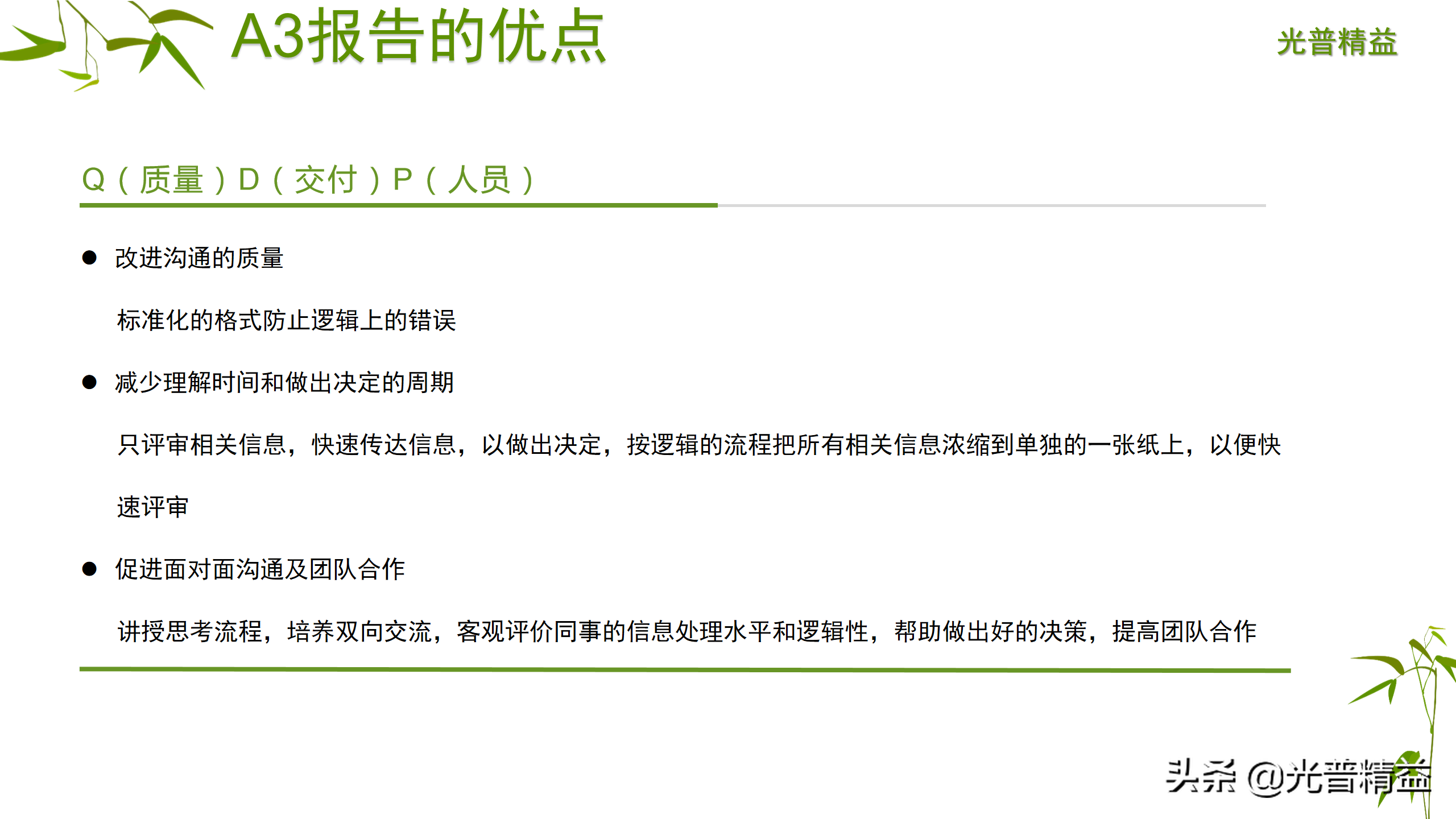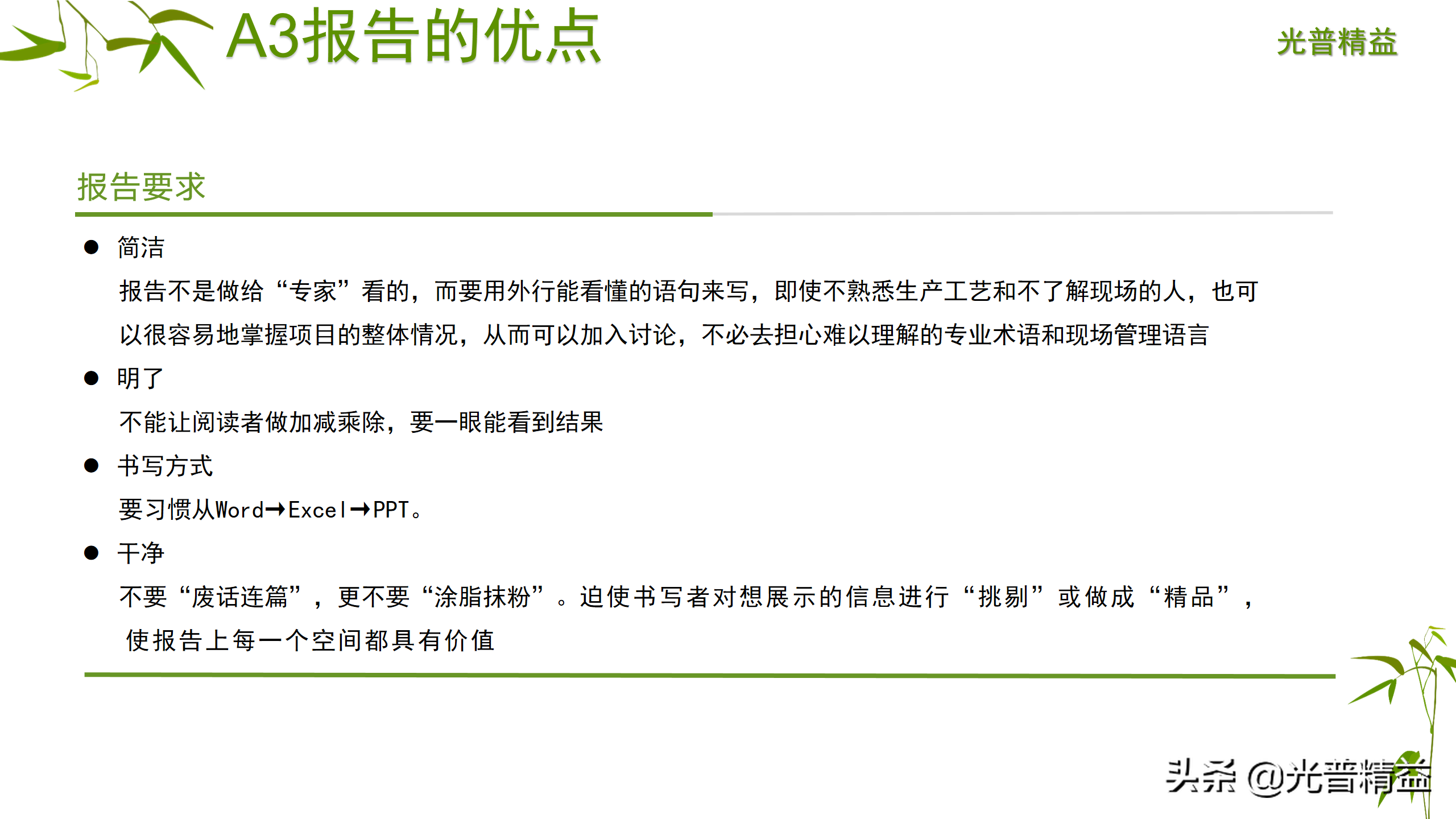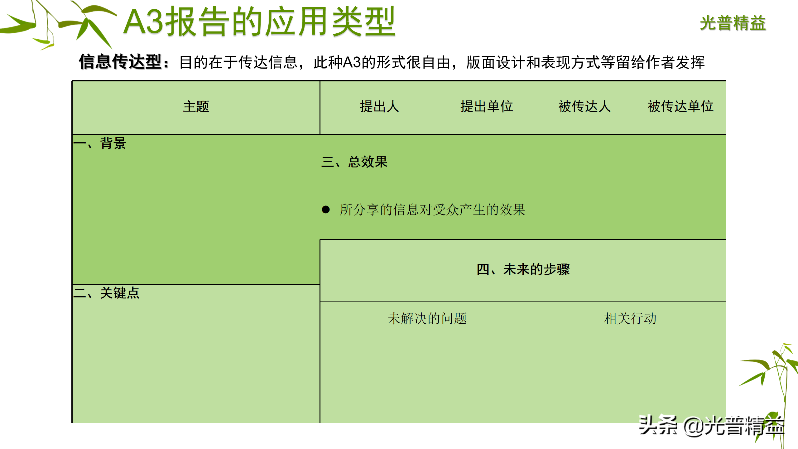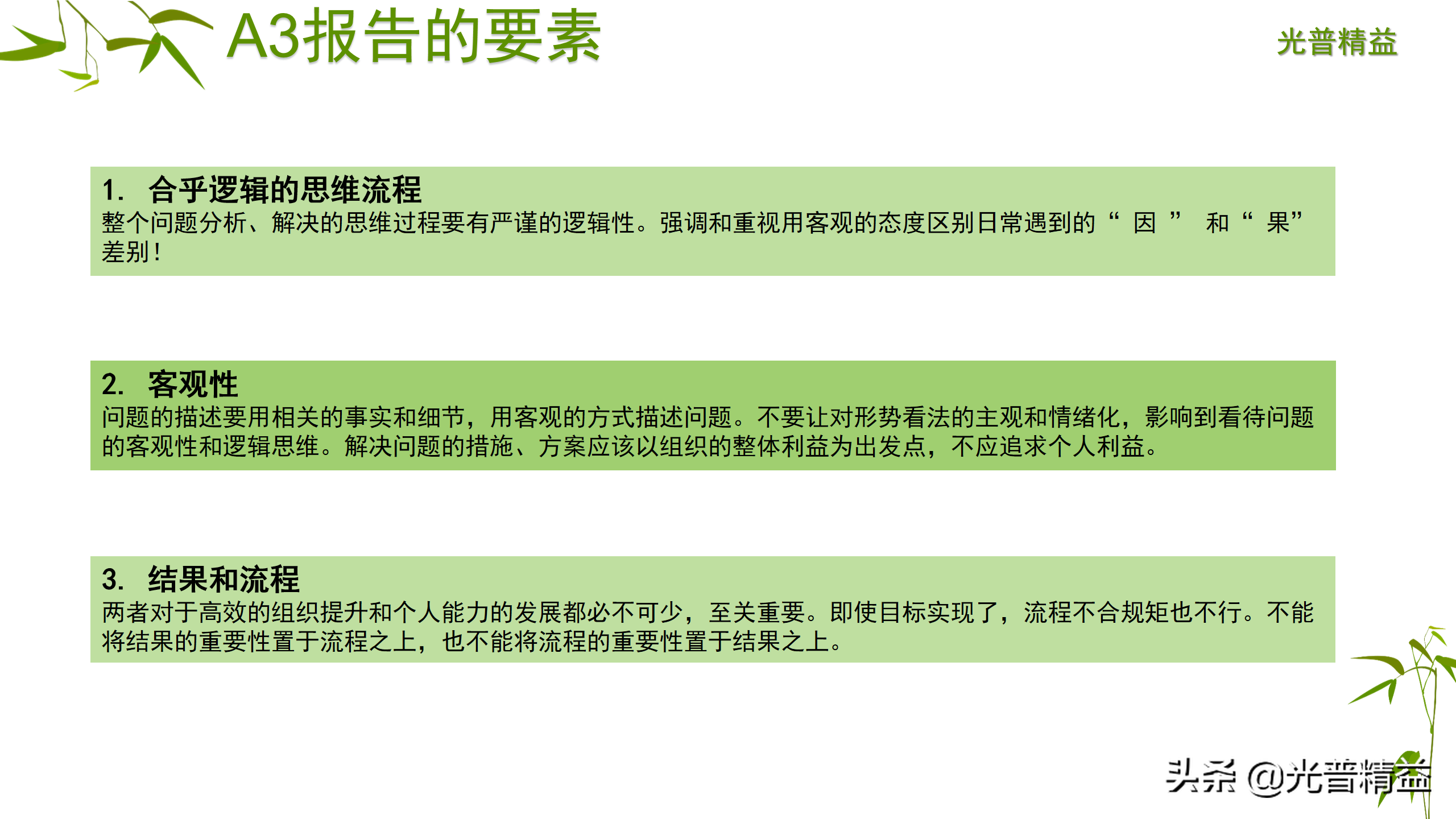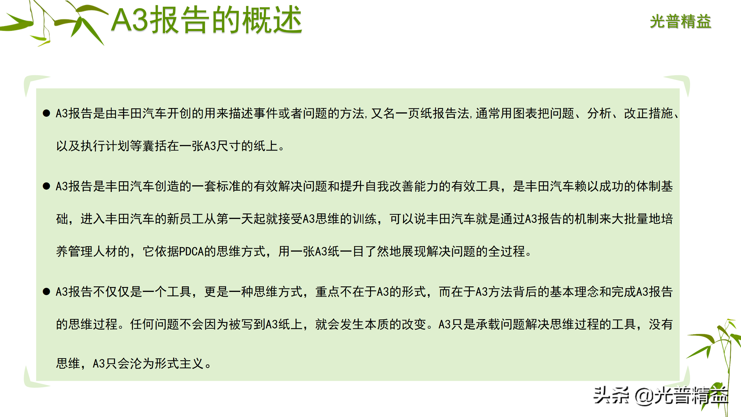 A3报告不仅仅是一个工具,更是一种思维方式,重点不在于A3的形式,而在于A3方法背后的基本理念和完成A3报告的思维过程。