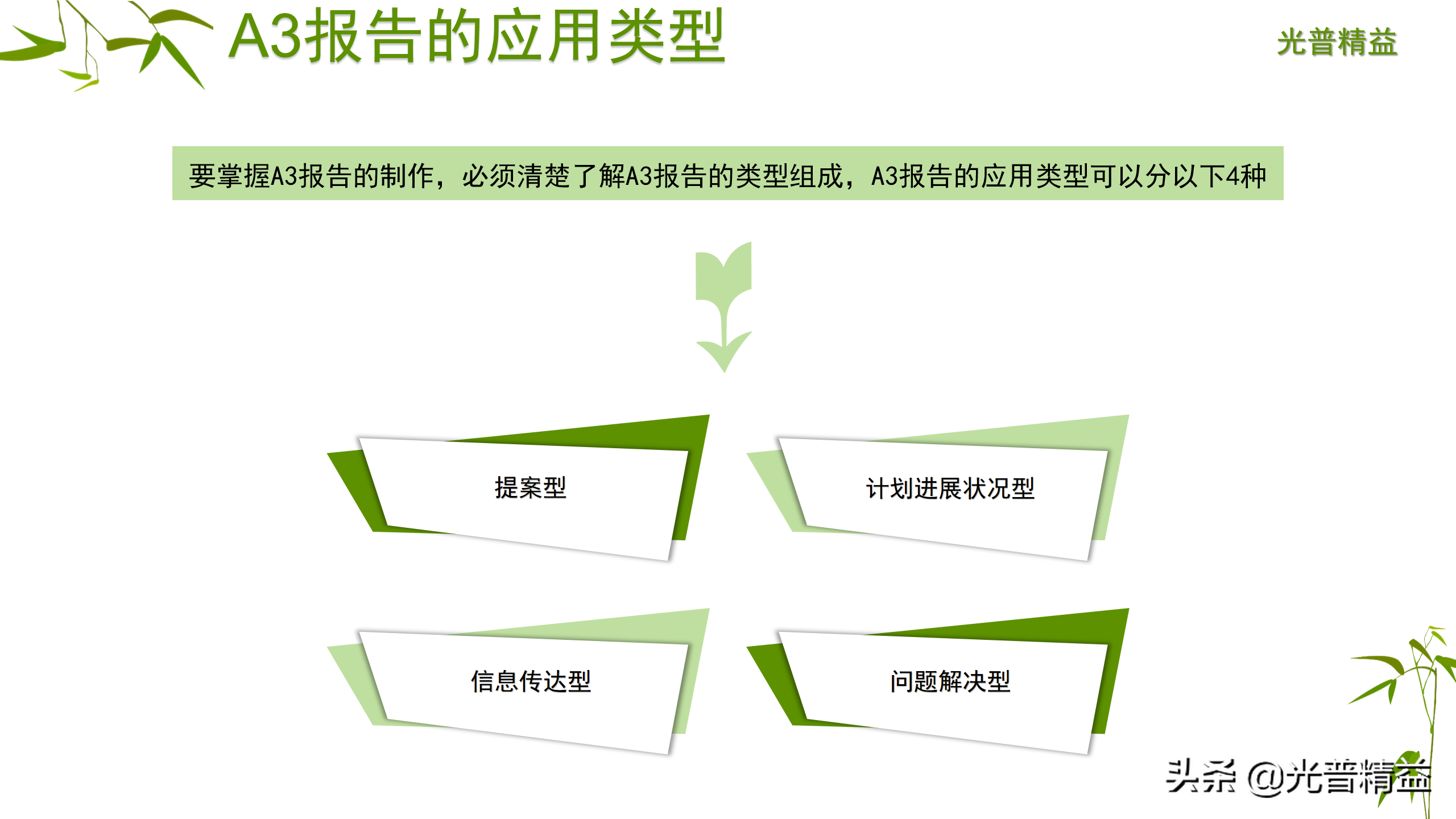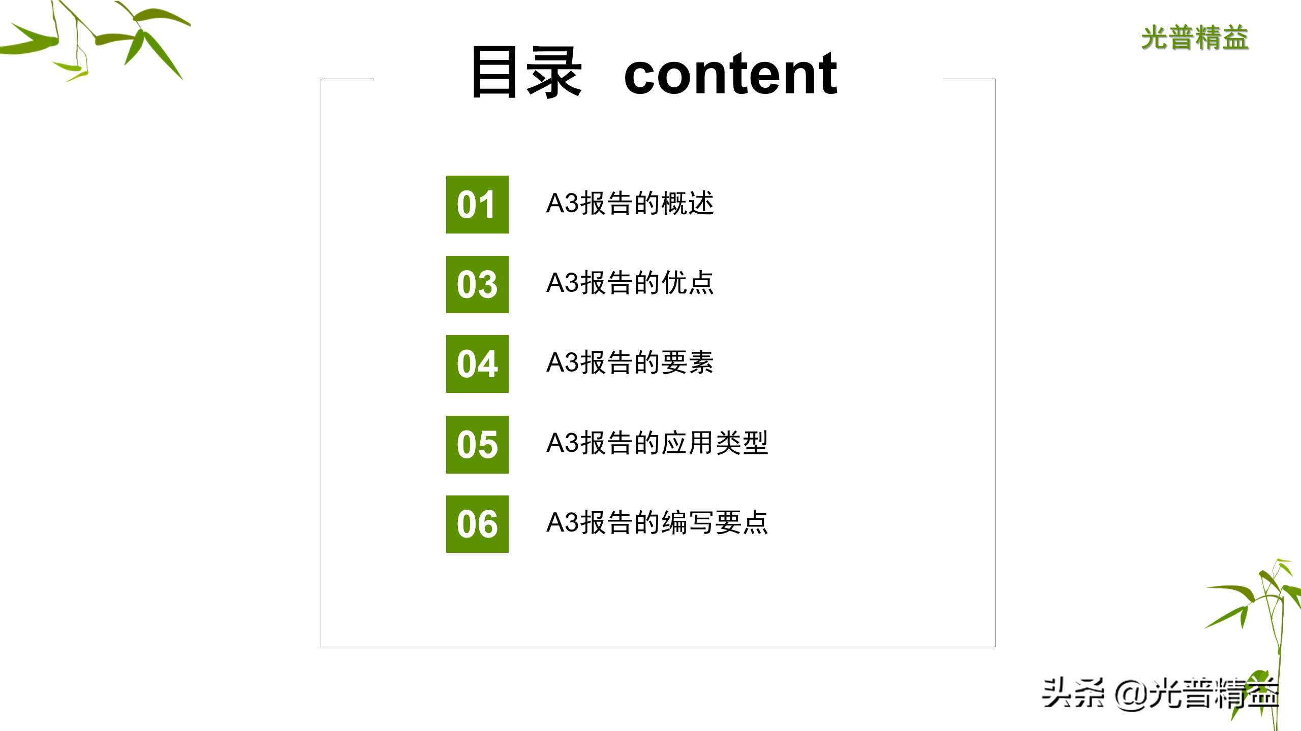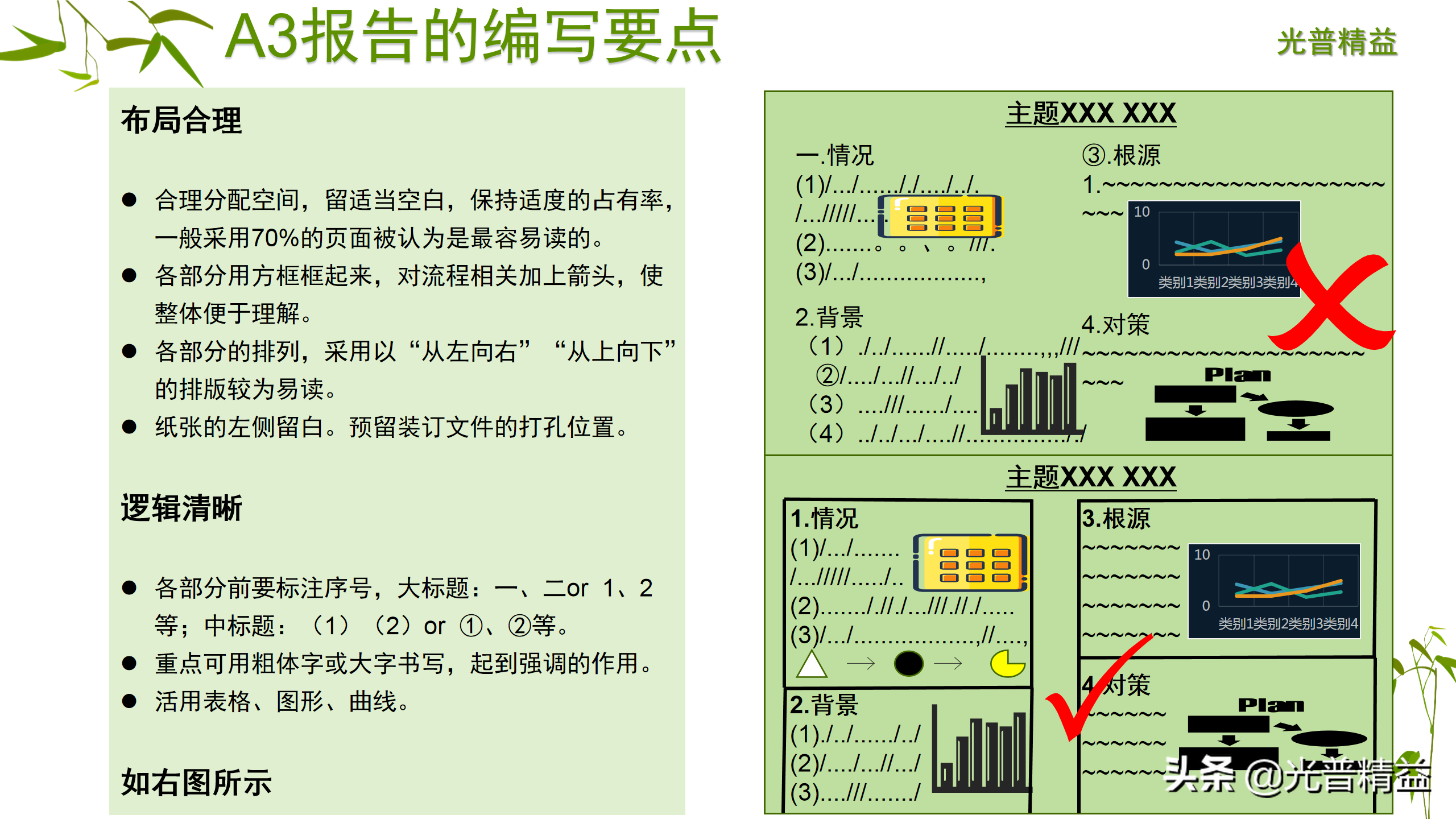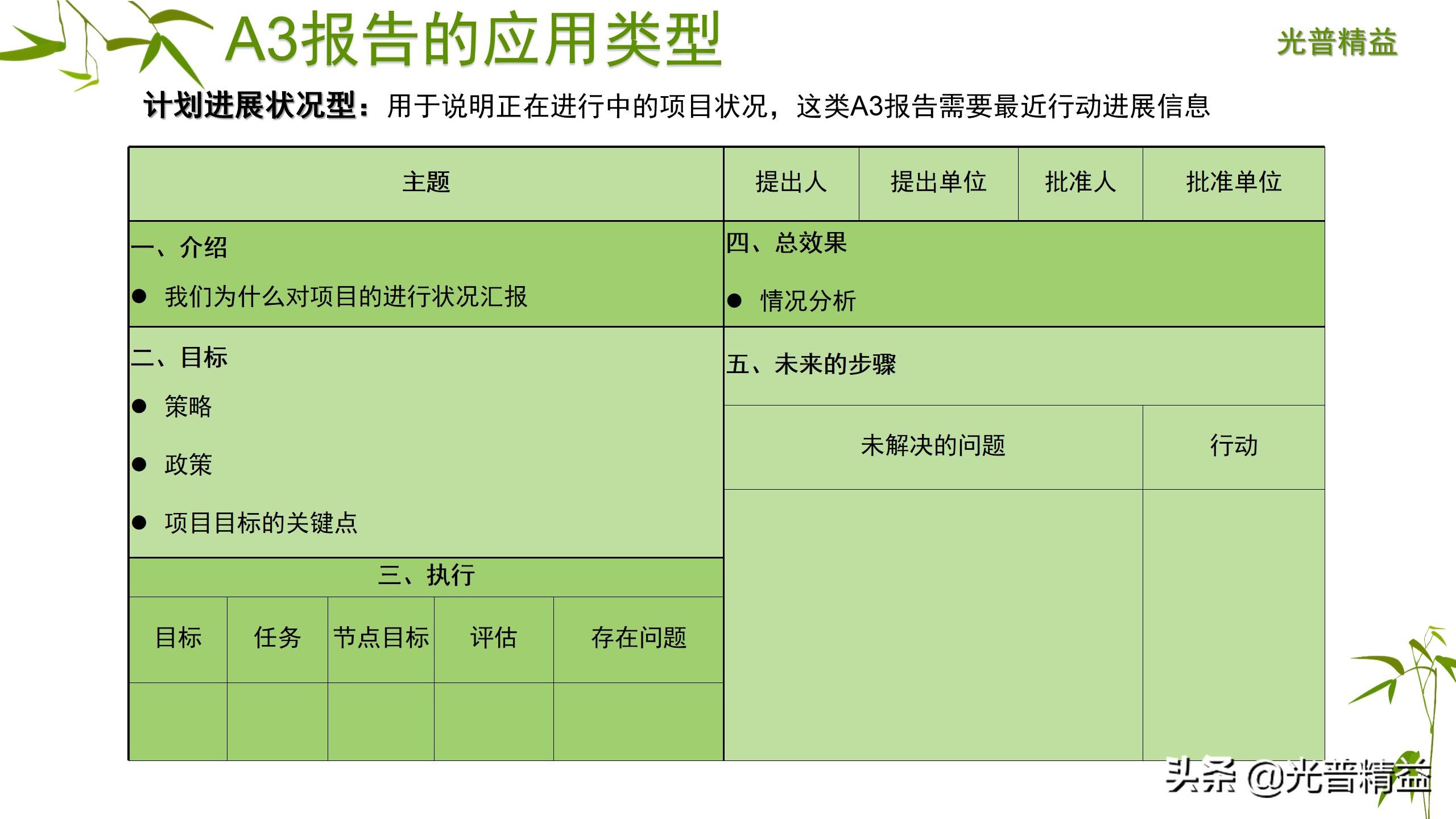 A3报告是由丰田汽车开创的用来描述事件或者问题的方法,又名一页纸报告法,通常用图表把问题、分析、改正措施、以及执行计划等囊括在一张A3尺寸的纸上。