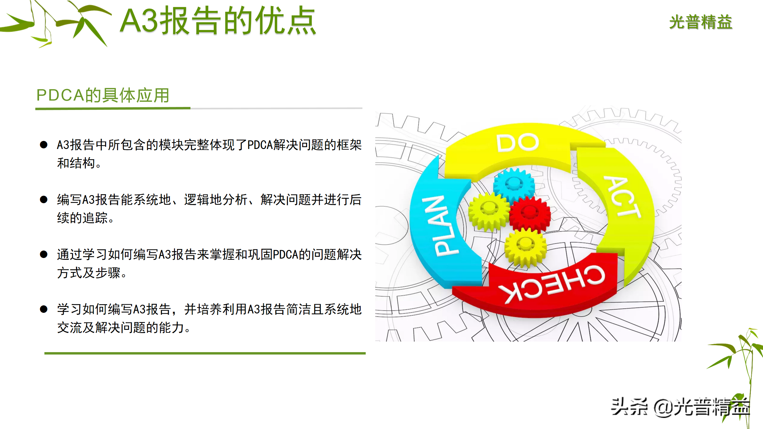 A3报告是丰田汽车创造的一套标准的有效解决问题和提升自我改善能力的有效工具,是丰田汽车赖以成功的体制基础,进入丰田汽车的新员工从第一天起就接受A3思维的训练,可以说丰田汽车就是通过A3报告的机制来大批量地培养管理人材的,它依据PDCA的思维方式,用一张A3纸一目了然地展现解决问题的全过程。