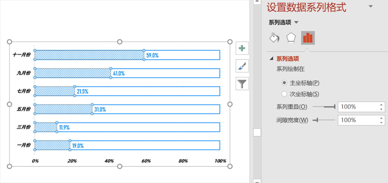 然后,将两组数据合并,可以将【系列叠加】调整为100%。