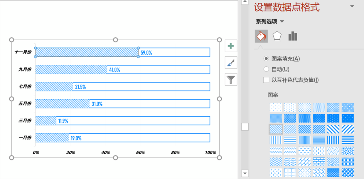 这种方法实现起来,也很出效果,插入条形图之后,使用两组设计,第一列数据一致,将其作为背景。