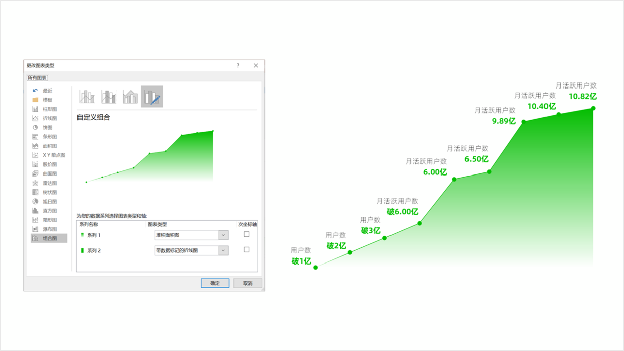 然后再图表中的【组合图】那里切换一下,这里使用的是折线图和面积图。