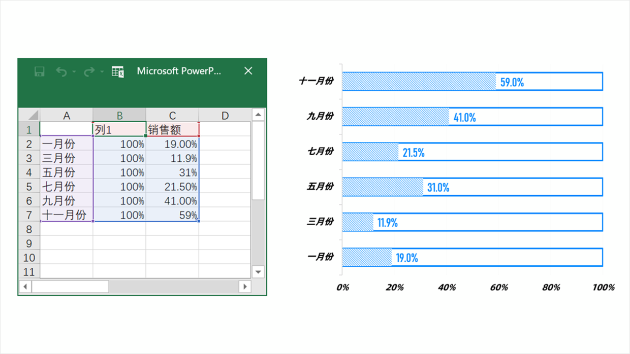 对于一些数据反差比较大的数据,有时没必要使用图表设计,可以借助一些形状表示,这种效果也会很精彩。