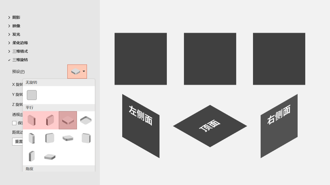那这个是怎么做的?其实是对三个正方形,进行了三维旋转,让他们组合在一起即可: