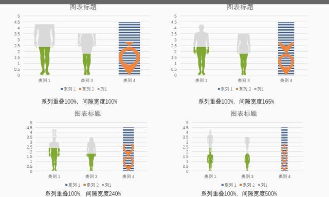我们先看下面的四个图表,通过这四个图表的制作来加深对系列重叠和间隙宽度的理解。