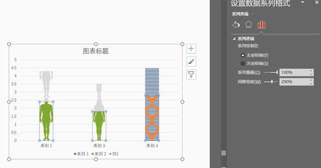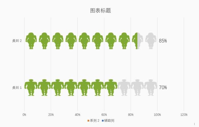 首先选中男灰色剪影,复制,再点击系列1,类型1第一个柱形图,再点击一次,CTRL+V,填充选择层叠,得到如下效果。鼠标点击一次系列1会选择整个系列1,再点击一次就只选择了系列中的一个图形。