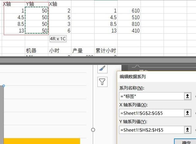 选择数据系列,选择数据,对标签进行编辑,XY轴的数据选择刚才的数据。点确定,会在下方出现四个标签点。