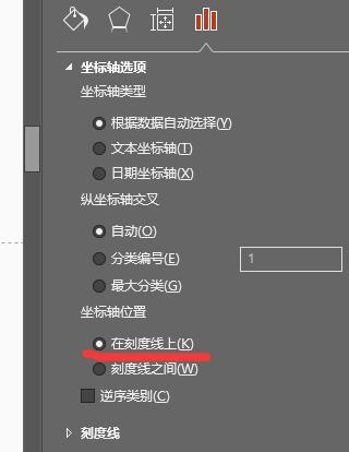 这个时候可以选中X轴,在坐标轴选项中,坐标轴位置勾选“在刻度线上”即可。
