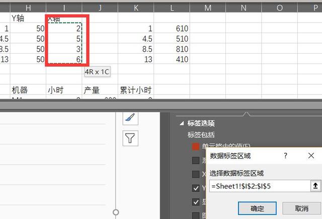 现在数据标签显示的是Y值,这里需要显示2536四个数字。数据中添加四个数字。