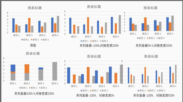 系列重叠是指每个系列之间是否有重叠,数值从-100%~100%,当数值为-100%的时候,系列之间无任何重叠,0%时,系列未重合但是边沿已经靠在一起了,100%时完全重合。
