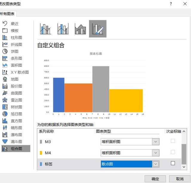 选择系列,选择更改图表类型,把刚才的标签改为散点图类型。