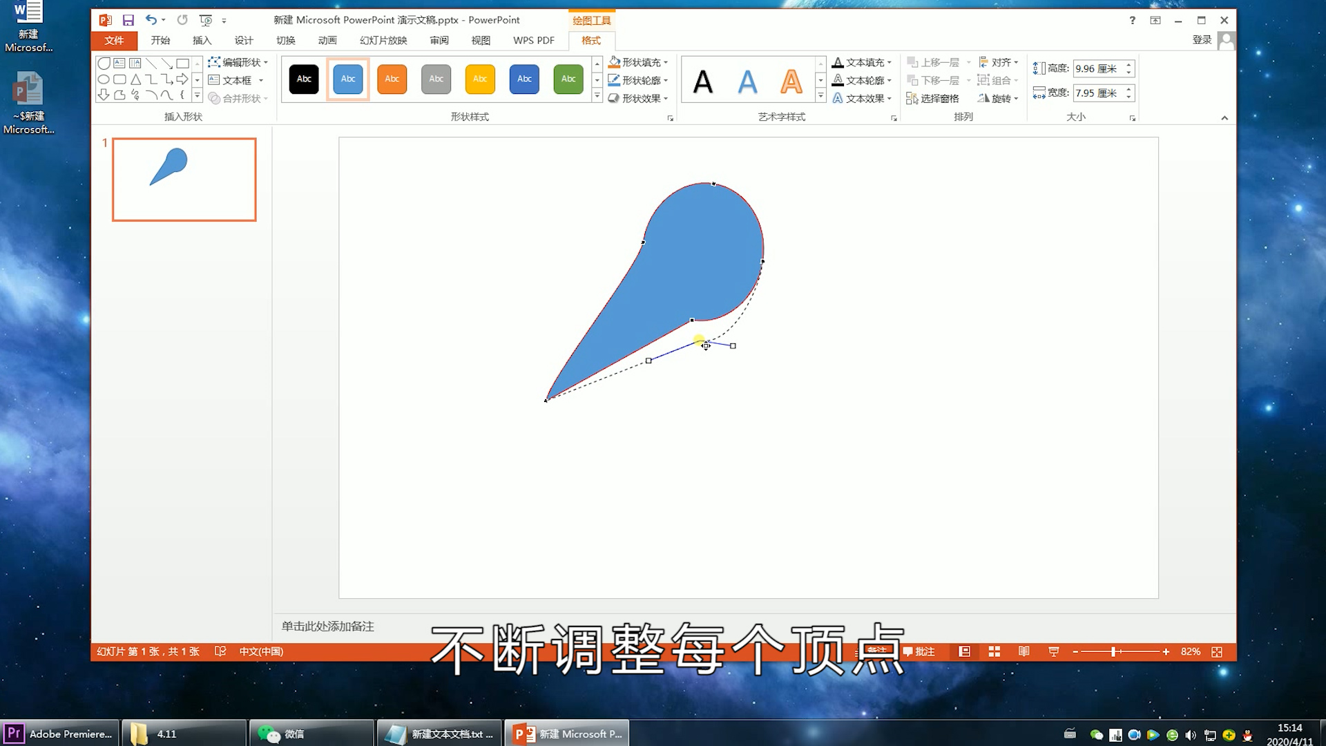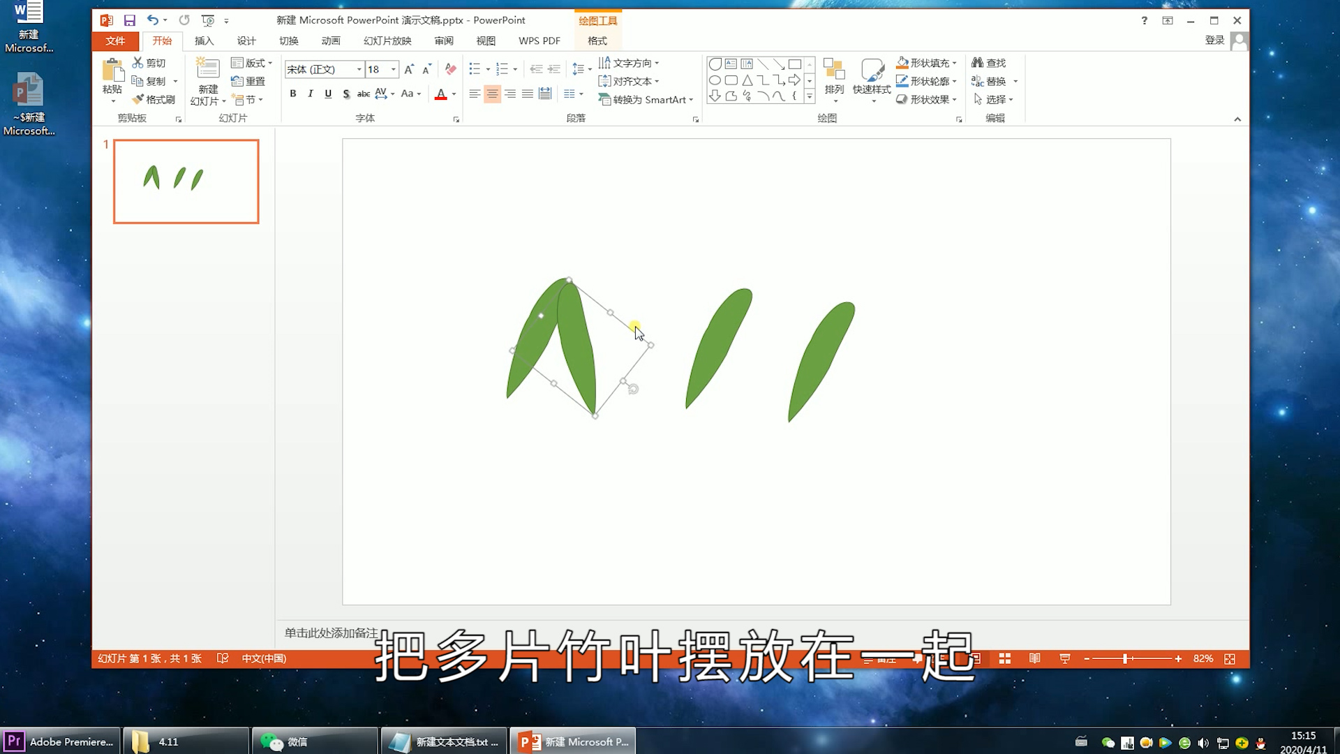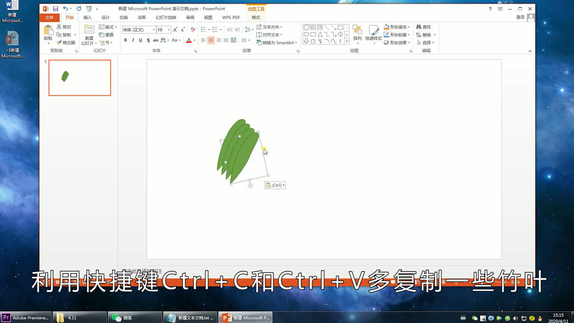 1.1.打开一个PPT空白页2.点击插入-形状,选择并画出一个泪滴形3.选择编辑顶点,不断调整每个顶点,修出一个竹叶的形状4.调整大小,并在格式中选择绿色,这样一个竹叶就画好了5.利用快捷键Ctrl+C和Ctrl+V多复制一些竹叶6.把多片竹叶摆放在一起,这样竹叶就画好了1.打开一个PPT空白页2.点击插入-形状,选择并画出一个泪滴形3.选择编辑顶点,不断调整每个顶点,修出一个竹叶的形状4.调整大小,并在格式中选择绿色,这样一个竹叶就画好了5.利用快捷键Ctrl+C和Ctrl+V多复制一些竹叶6.把多片竹叶摆放在一起,这样竹叶就画好了