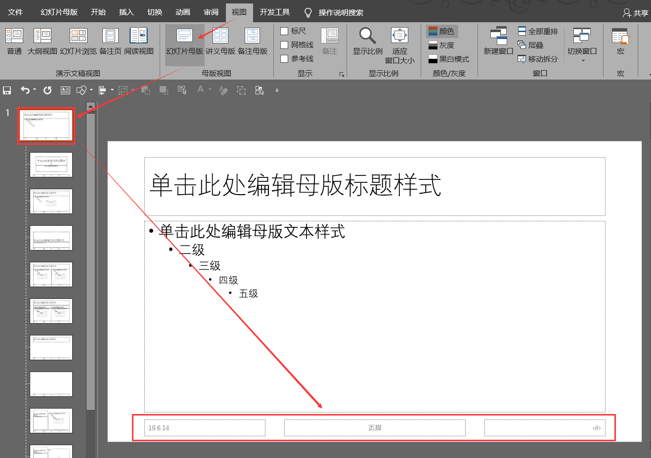 页眉和页脚:要想修改页眉和页脚的位置,就在母版里面修改