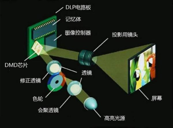 还有性能更高一点的DLP(Digital Light Processor)投影机也比较普遍,它分为单片式和三片式。其关键成像器件数字微透镜装置 (Digital Micromirror Device,DMD)是半导体元件。该元件具有快速反射式数字开关性能,能够准确控制光源。光通过一高速旋转的三色透镜投射在DMD部件上,经反射后可通过镜头投射到影幕上形成图像。