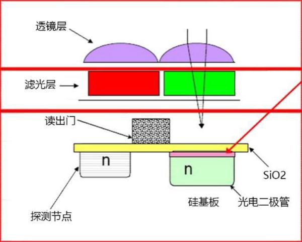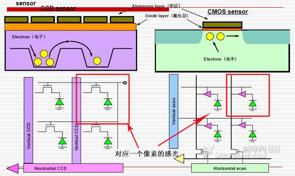 大致可分为聚集二极管微前光的微透镜、将光滤成单色光的滤光层和感应光线的感光二极管。不同的光线照射到感光二极管上,可以输出不同的信号电平。下面是CCD和CMOS的感光二极管排列,因感光二极管的构造不同,所以CCD和CMOS的感光阵列结构也不同,但最终都可以通过数字信号处理和转换后形成我们熟悉的照片。而摩尔纹的出现,也主要是在感光二极管层形成的。
