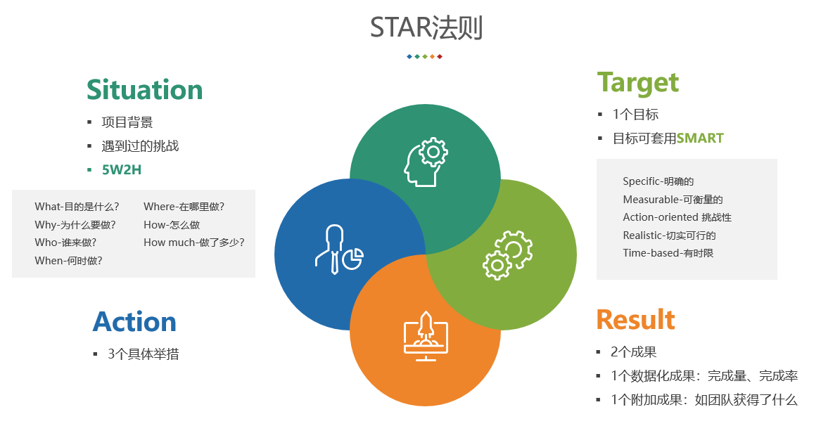 - Situation:说明这项工作的背景和遇到的挑战,可以通过5W2H法则来陈述