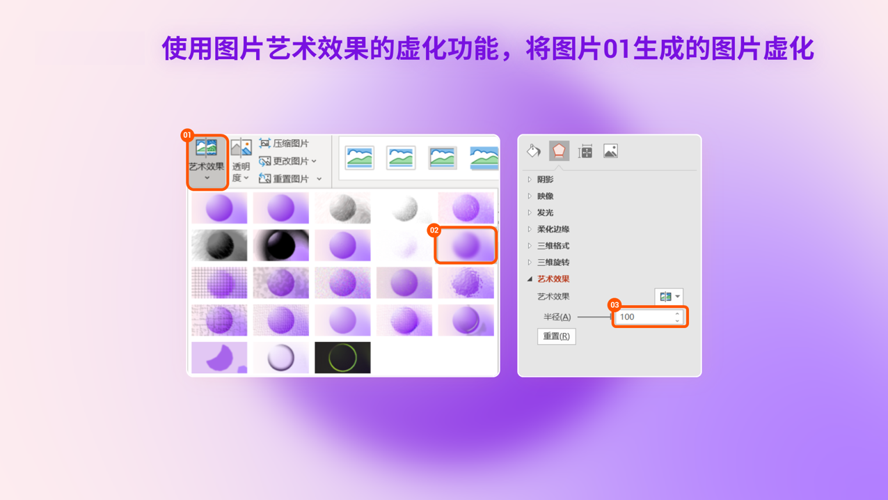 06. 选中图片01,点击右键,再设置背景格式中,找到艺术效果,选择图片虚化。(或者是双击图片01 ,在界面左上角也可以找到效果艺术)