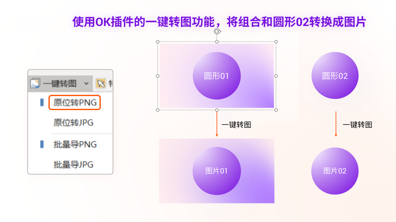 这里需要借助一个PPT插件——OneKey Lite,依次先将组合过的【图片01】、【圆形02】一键转图片。