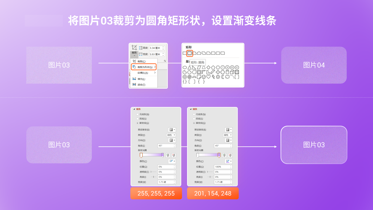 11. 将图片03裁剪为圆角矩形,并设置渐变线条: