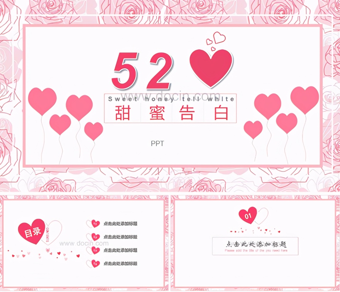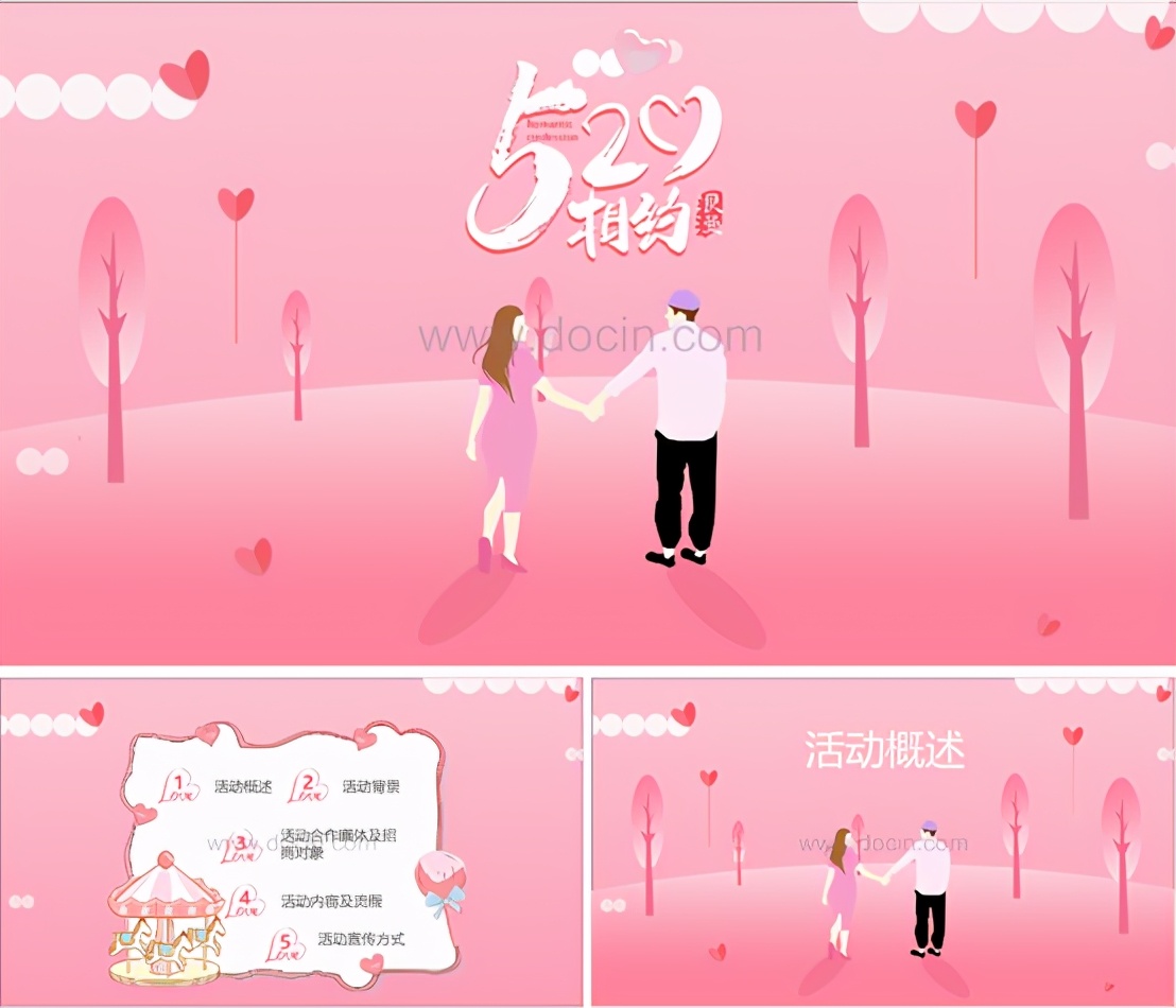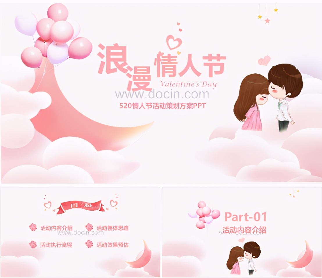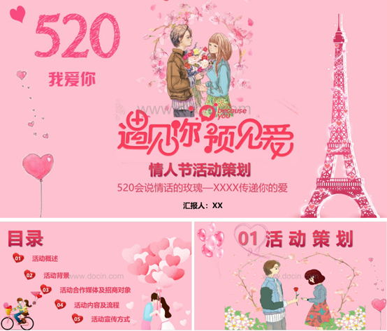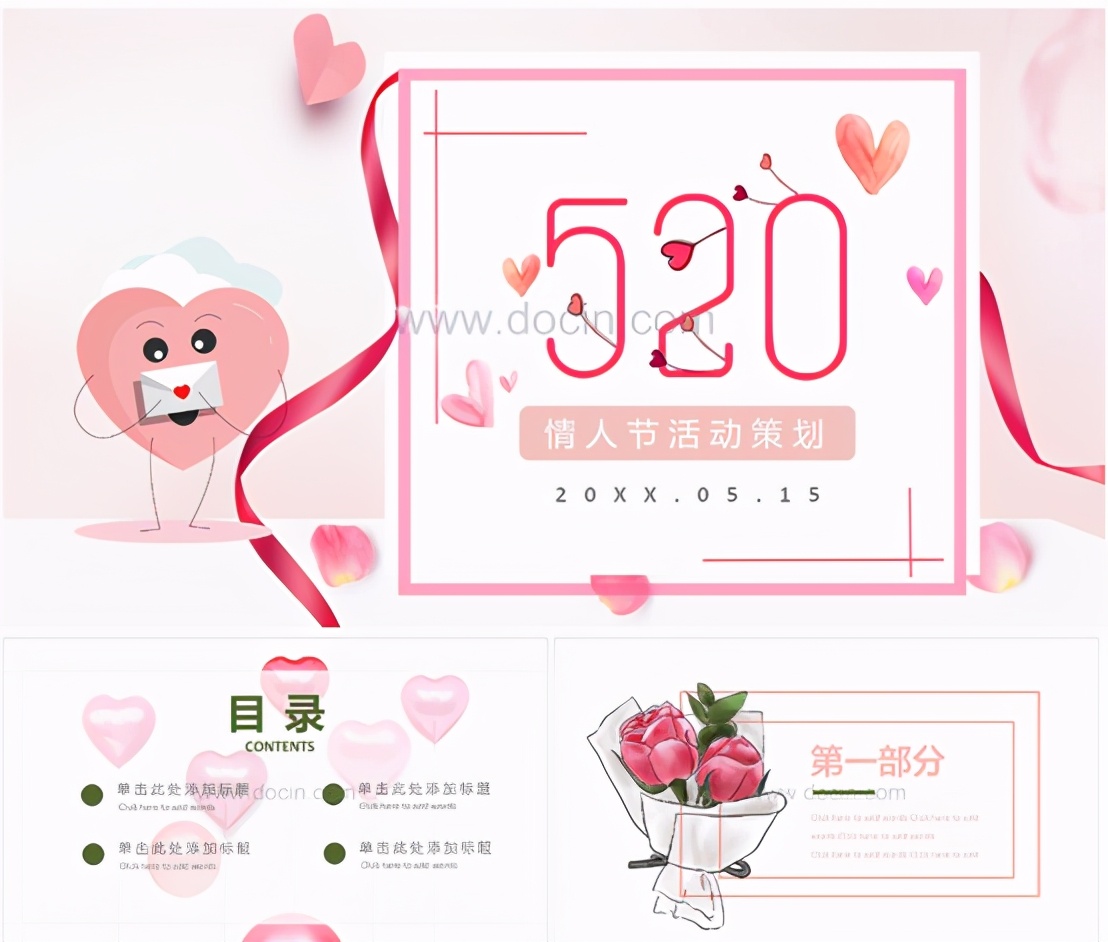 3.分享的是有关520表白日PPT模板,适用于【情人节策划】【策划方案】【活动策划】【节日庆典】等场合!1.520爱情表白情人节结婚活动策划PPT模板2.520表白日情人节活动策划方案PPT模板 3. 2021年相约520情人节活动策划PPT课件4. 520网络情人节活动策划PPT课件5. 520情人节活动方案策划通用PPT模板本文素材下载方法:在PC端查找豆丁网,找到“素材”频道,在豆丁素材里面查找“520”选择PPT模板分类!
