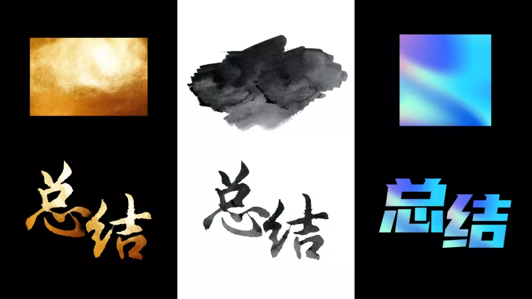 当然,还可以使用更加直接的做法,就是把纹理图片填充到文字中。比如,烫金纹理、笔刷纹理、渐变纹理: