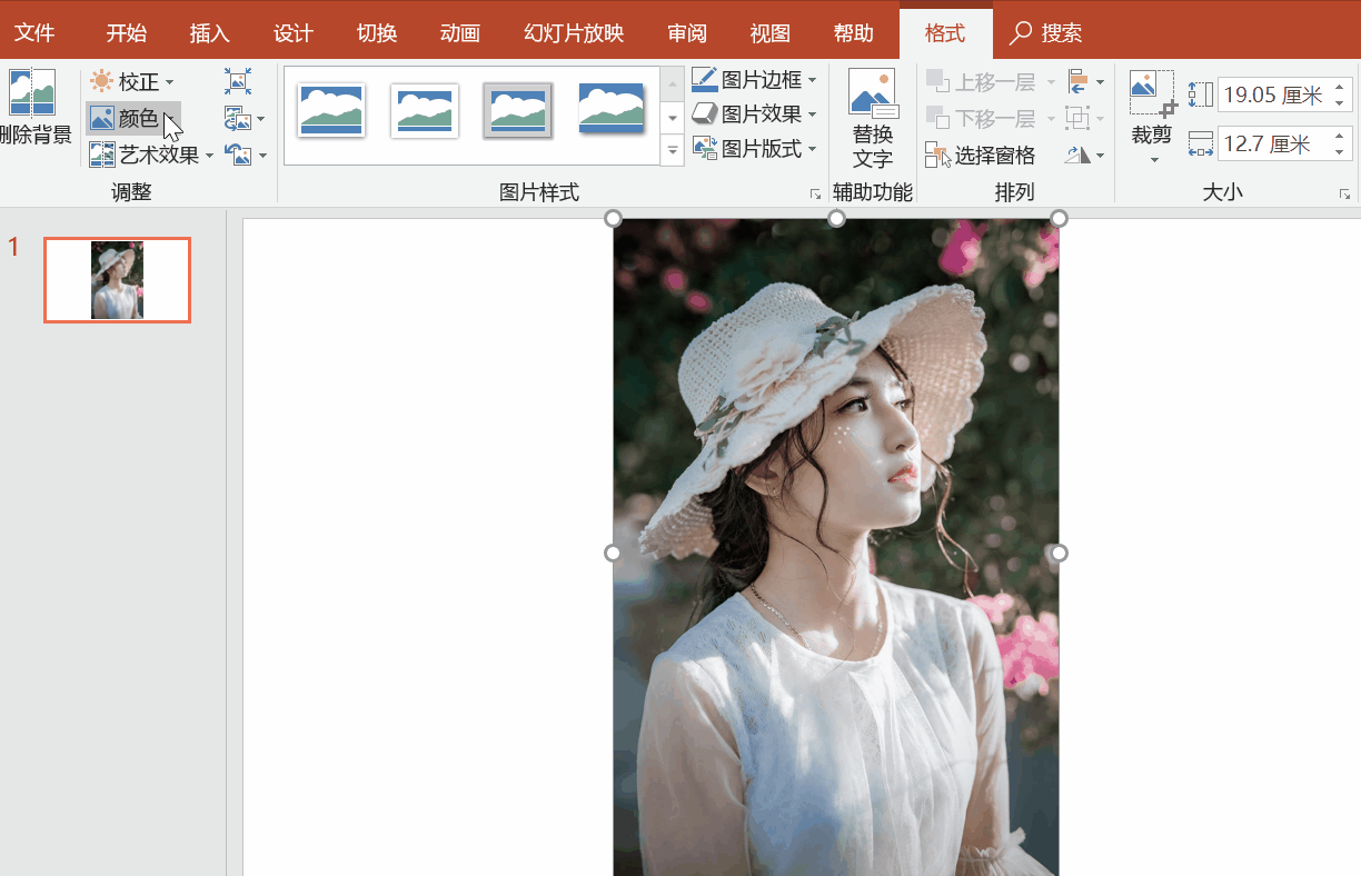 例如图片的调色,有时候我们找到的素材并不是那么完美,可能颜色偏暗,或者颜色跟我们的主题不搭,那么我们可以选中图片,点击【格式】——【颜色】——【重新着色】,在这里就可以快速给图片调色!