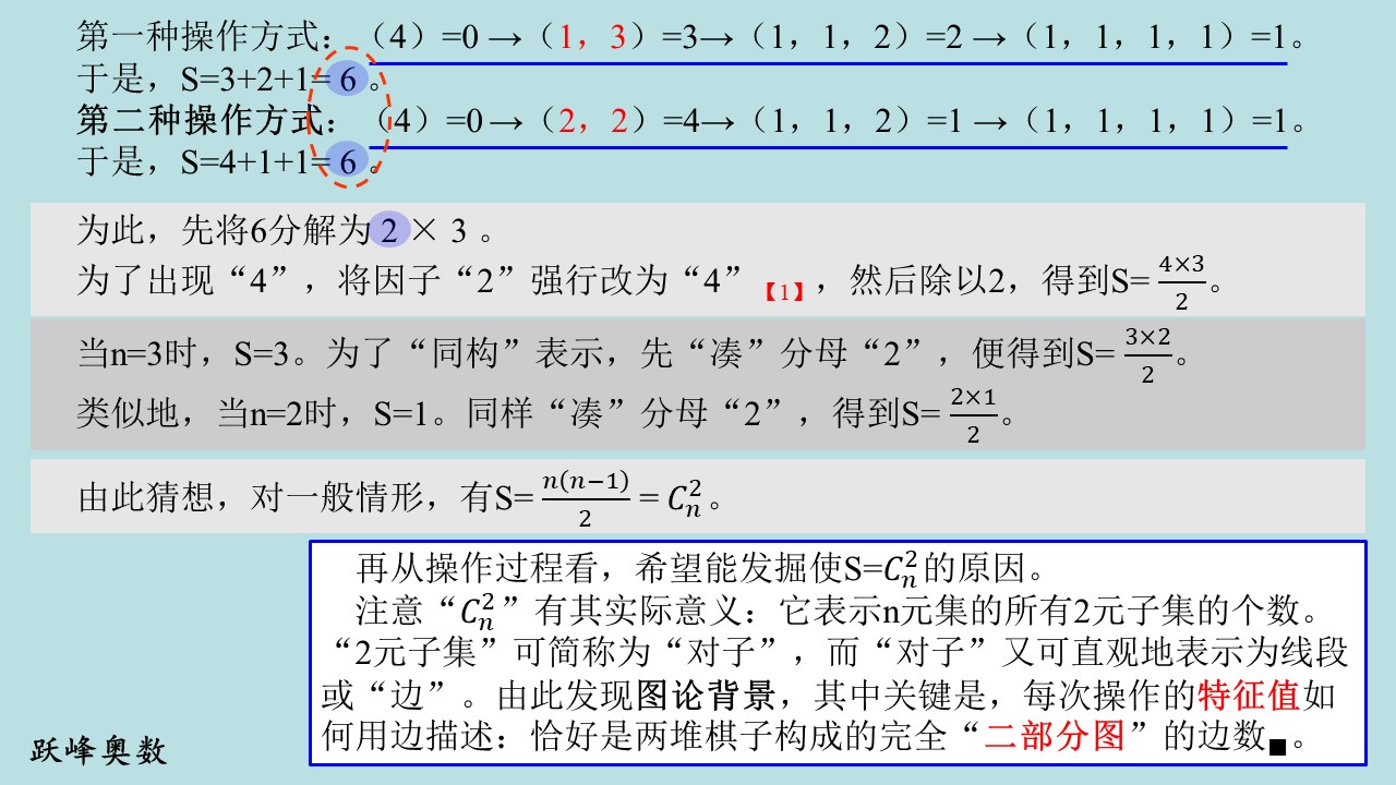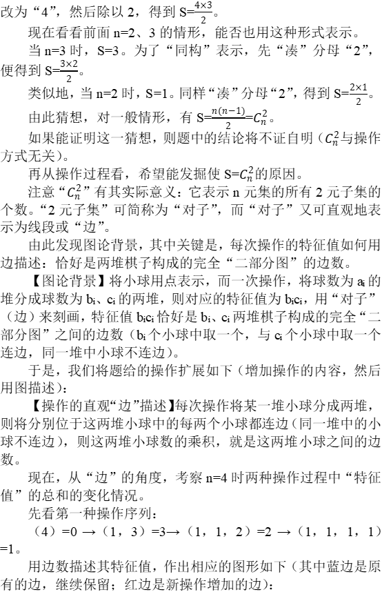 【操作的直观“边”描述】每次操作将某一堆小球分成两堆,则将分别位于这两堆小球中的每两个小球都连边(同一堆中的小球不连边),则这两堆小球数的乘积,就是这两堆小球之间的边数。