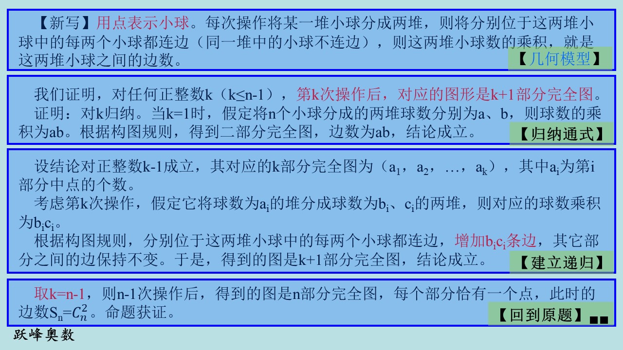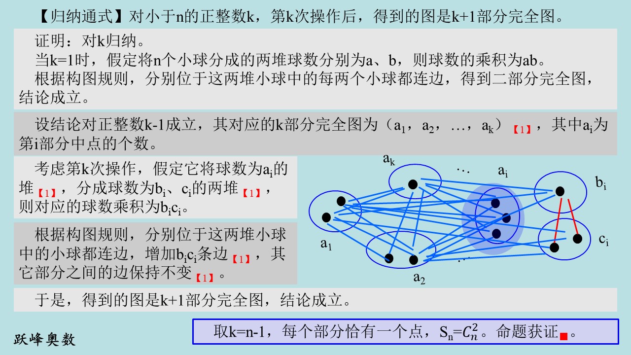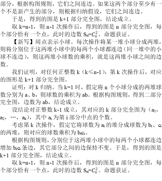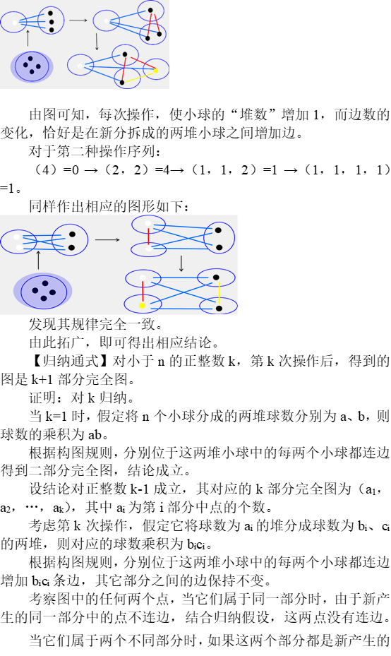 证明:对k归纳。当k=1时,假定将n个小球分成的两堆球数分别为a、b,则球数的乘积为ab。根据构图规则,得到二部分完全图,边数为ab,结论成立。