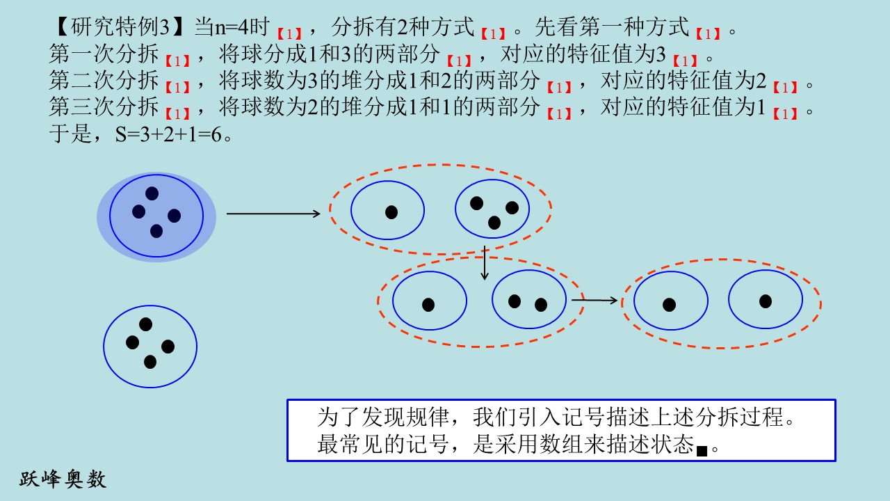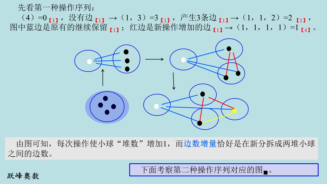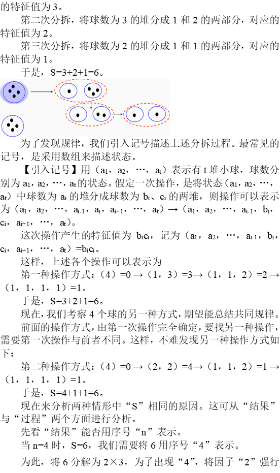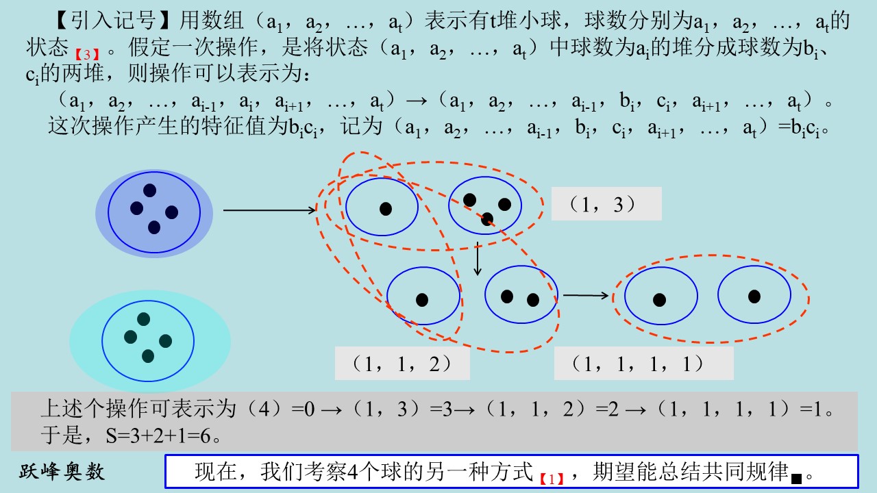【引入记号】用(a1,a2,…,at)表示有t堆小球,球数分别为a1,a2,…,at的状态。假定一次操作,是将状态(a1,a2,…,at)中球数为ai的堆分成球数为bi、ci的两堆,则操作可以表示为(a1,a2,…,ai-1,ai,ai+1,…,at)→(a1,a2,…,ai-1,bi,ci,ai+1,…,at)。