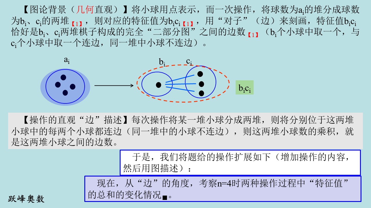 【图论背景】将小球用点表示,而一次操作,将球数为ai的堆分成球数为bi、ci的两堆,则对应的特征值为bici,用“对子”(边)来刻画,特征值bici恰好是bi、ci两堆棋子构成的完全“二部分图”之间的边数(bi个小球中取一个,与ci个小球中取一个连边,同一堆中小球不连边)。