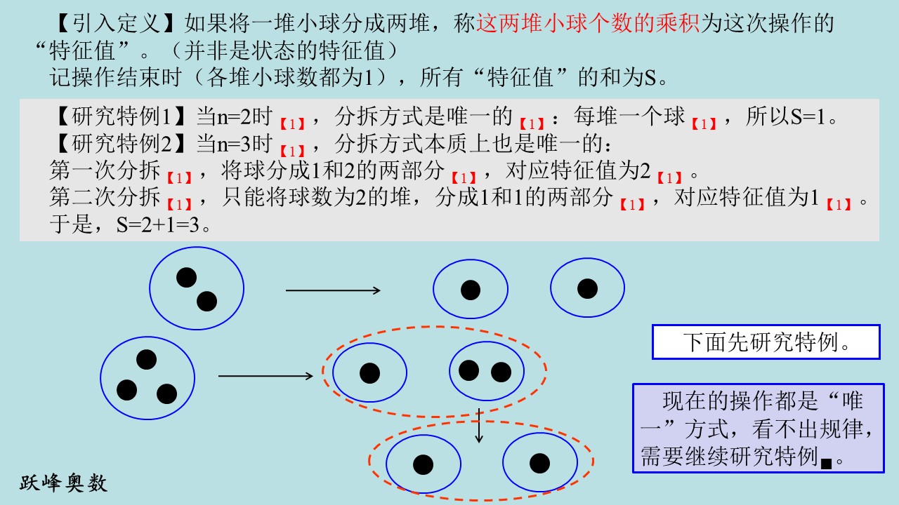 【研究特例1】当n=2时,分拆方式是唯一的:每堆一个球,所以S=1。