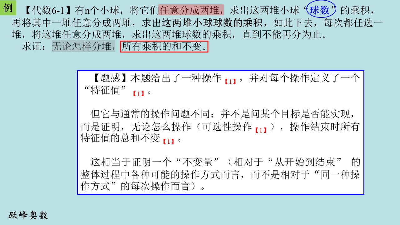 这相当于证明一个“不变量”(相对于“从开始到结束” 的整体过程中各种可能的操作方式而言,而不是相对于“同一种操作方式”的每次操作而言)。