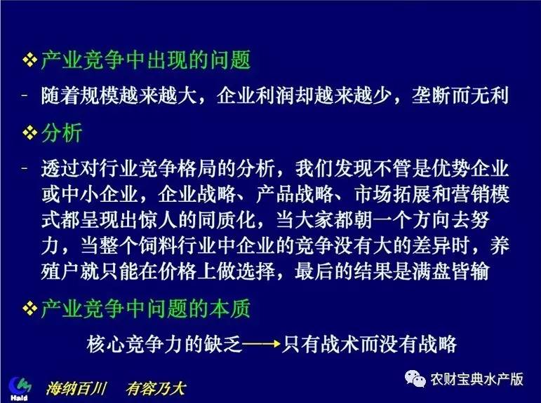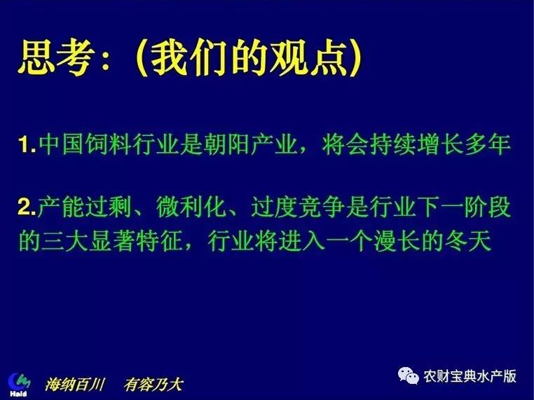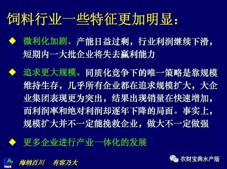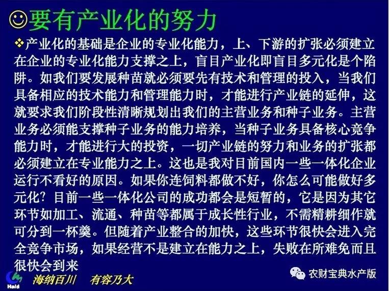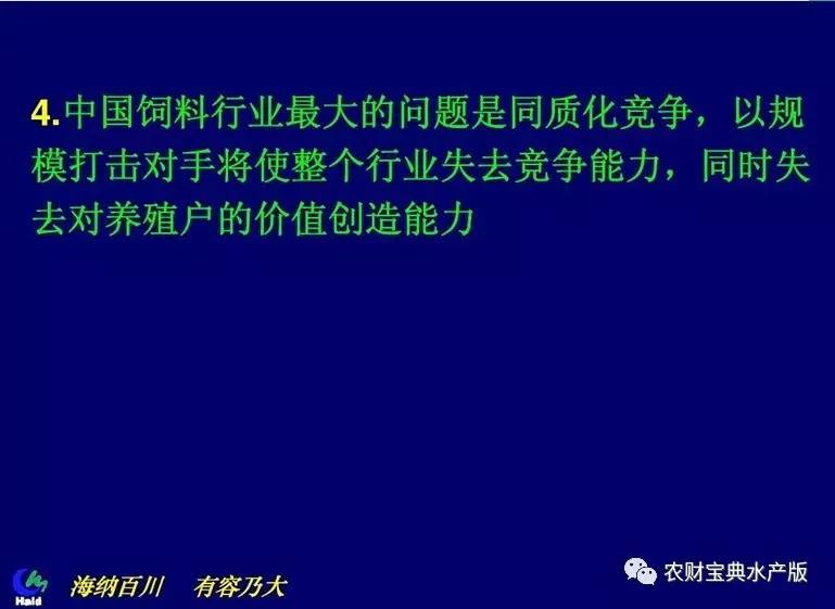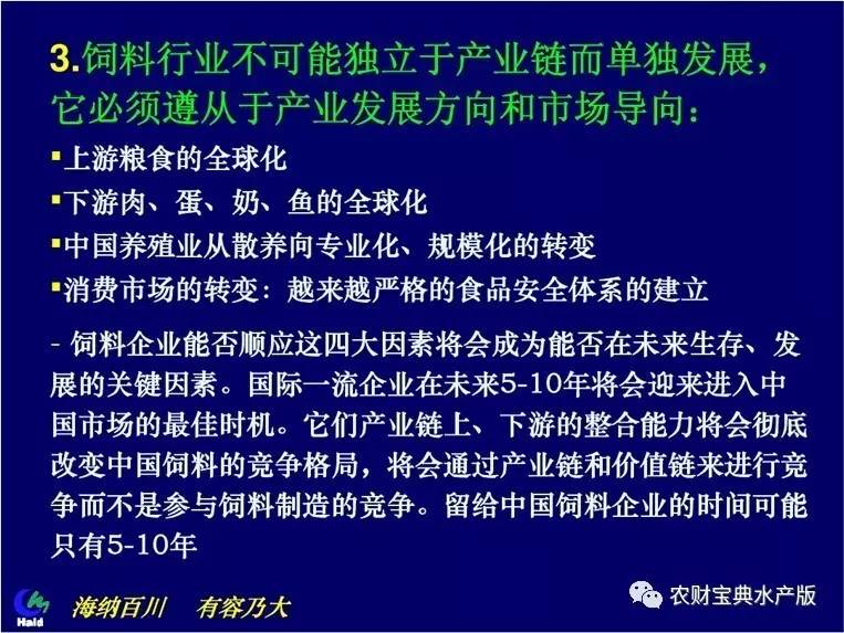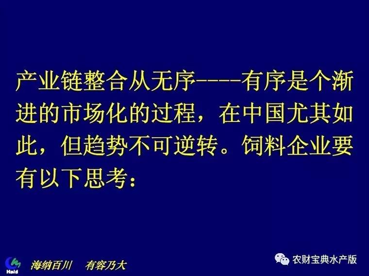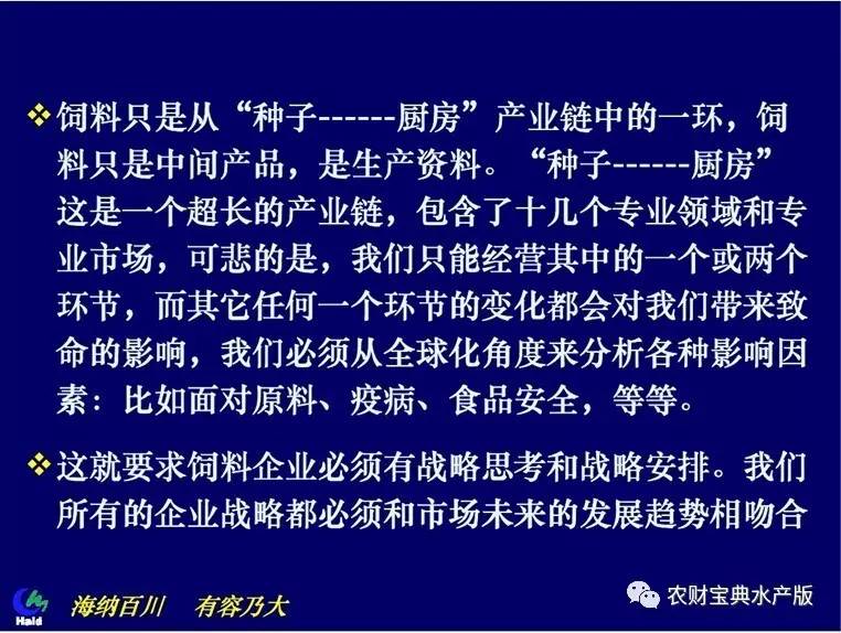 今天回过头来看,薛华不愧为农牧业的思想战略家,如今整个中国农牧业的变革现状几乎都在他十年前的这份PPT中演变过,养殖病害繁多、原料价格波动、食品安全、产品同质化、价格战频繁、产能过剩、大批饲料企业被淘汰,等等,他鲜明地指出饲料企业发展必须要有产业链思维和产业化努力,必须要坚持专业化能力,才能在竞争长河中屹立于不败之地。