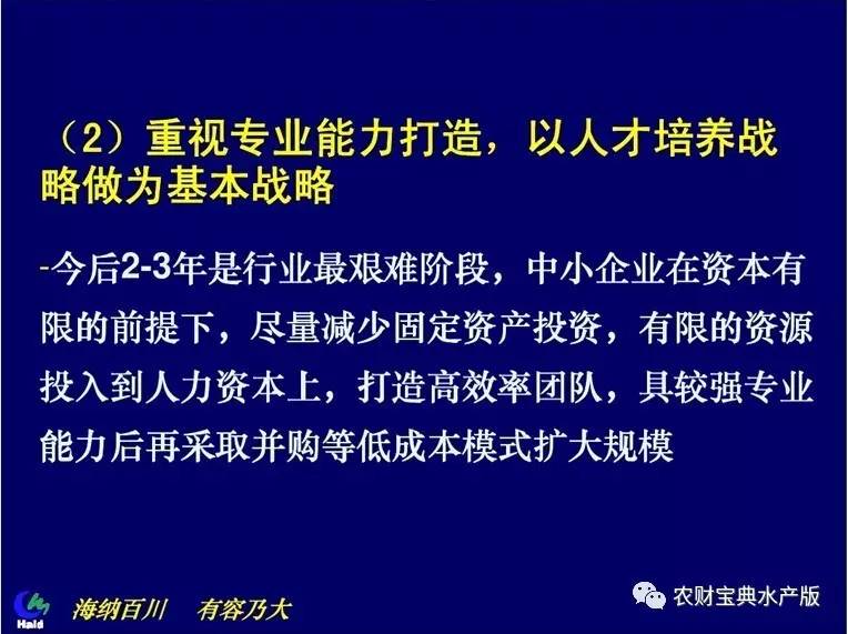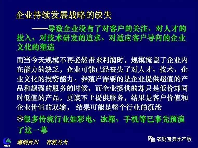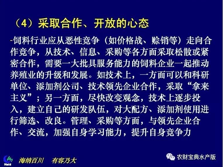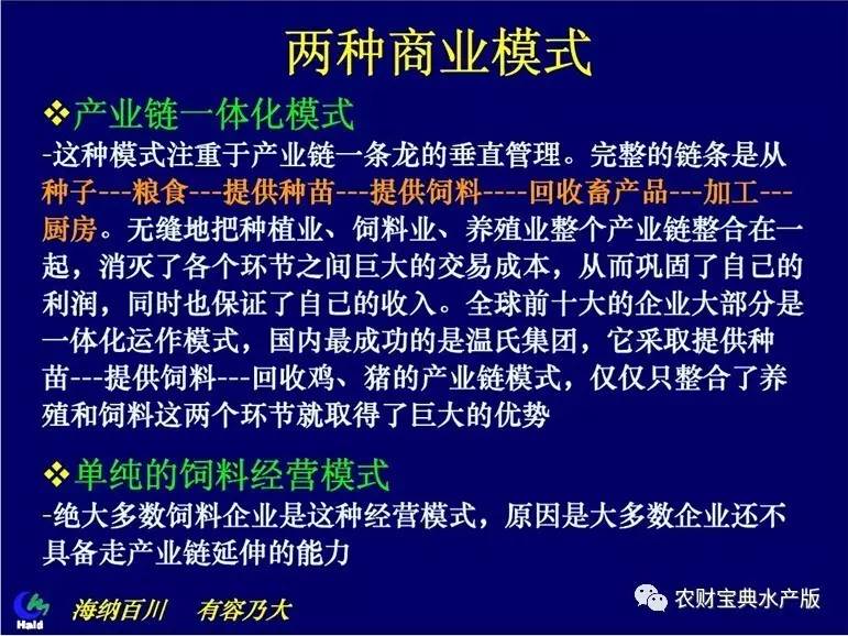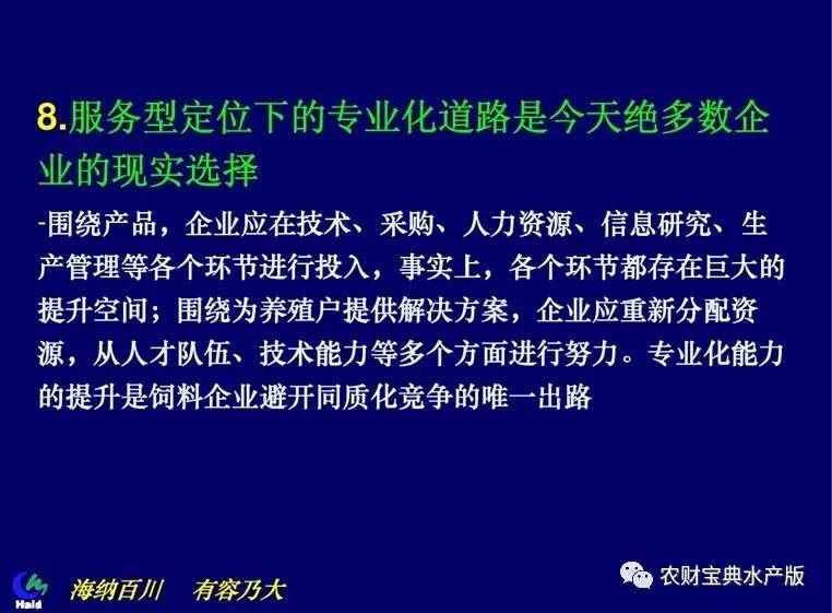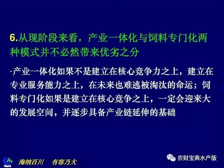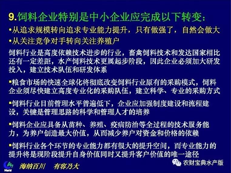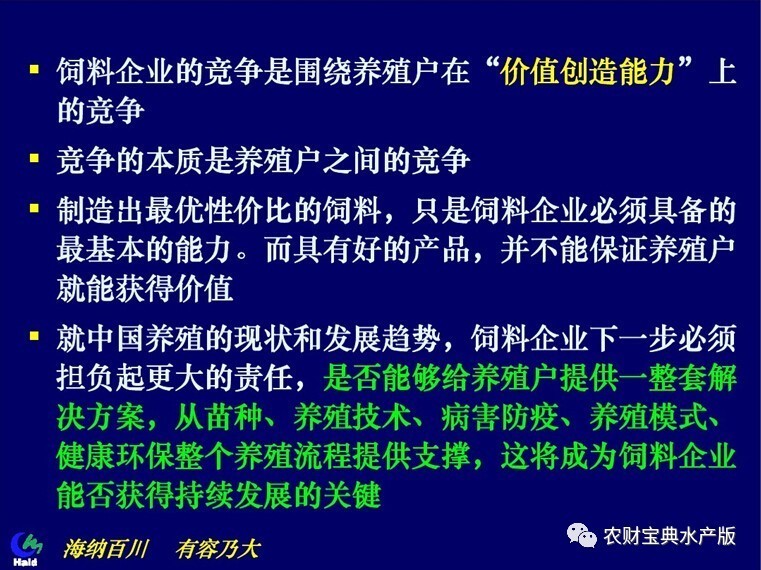 今天回过头来看,薛华不愧为农牧业的思想战略家,如今整个中国农牧业的变革现状几乎都在他十年前的这份PPT中演变过,养殖病害繁多、原料价格波动、食品安全、产品同质化、价格战频繁、产能过剩、大批饲料企业被淘汰,等等,他鲜明地指出饲料企业发展必须要有产业链思维和产业化努力,必须要坚持专业化能力,才能在竞争长河中屹立于不败之地。