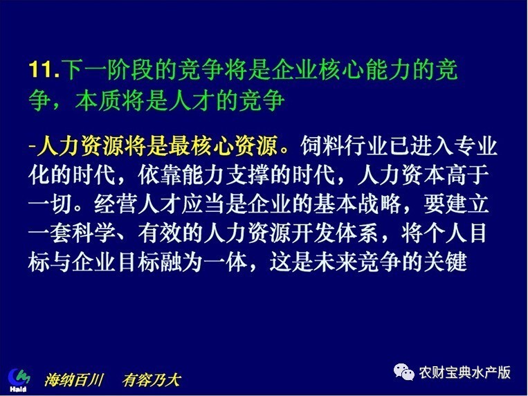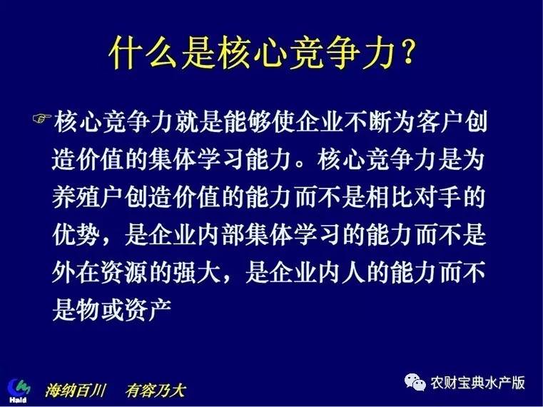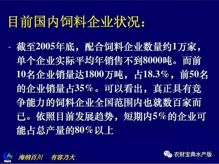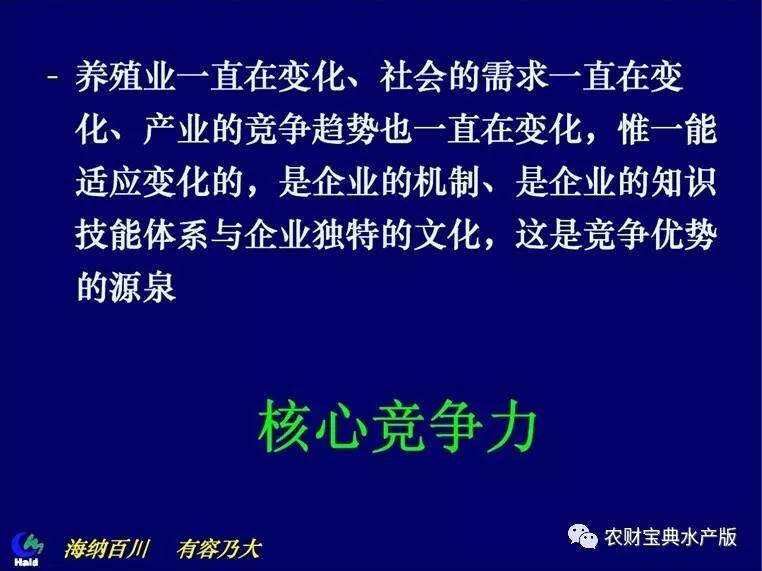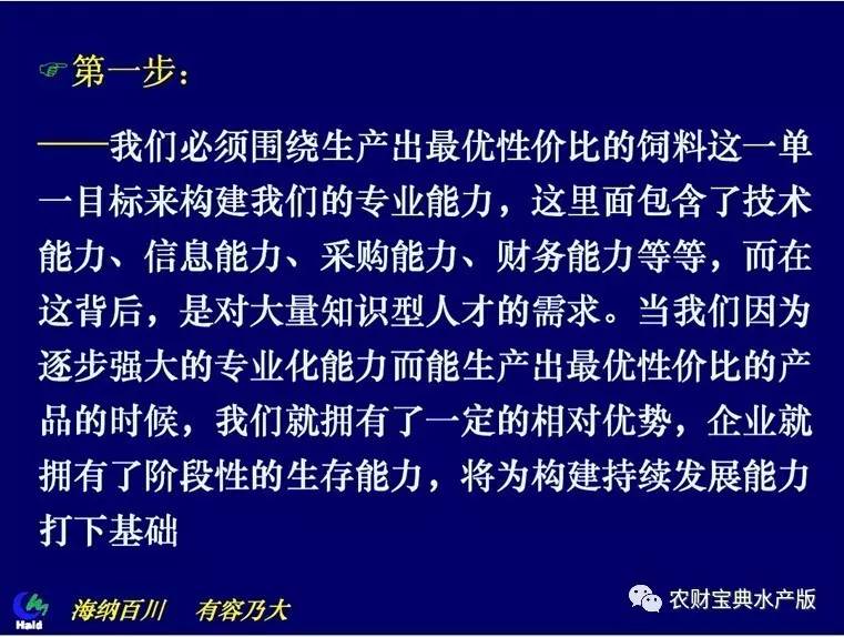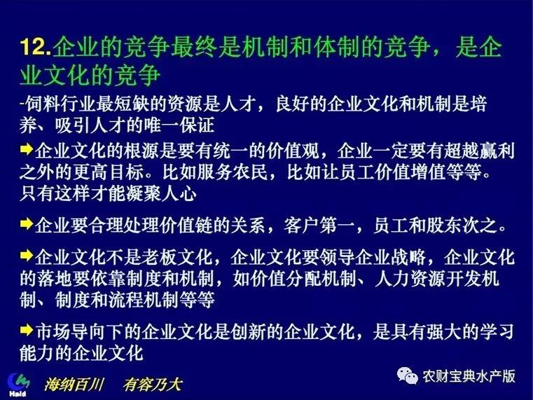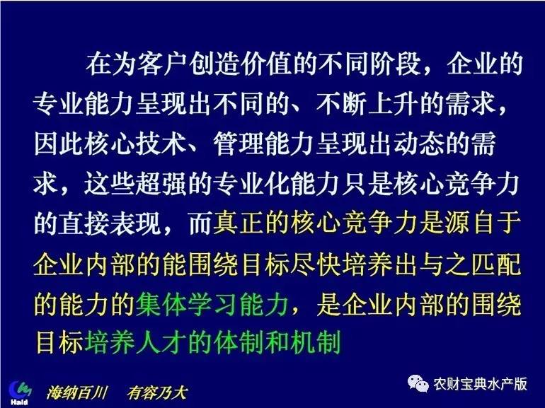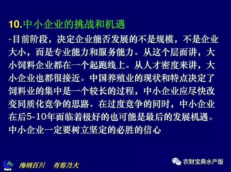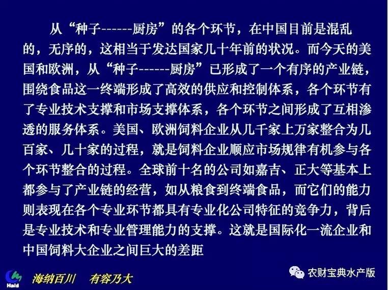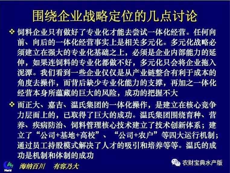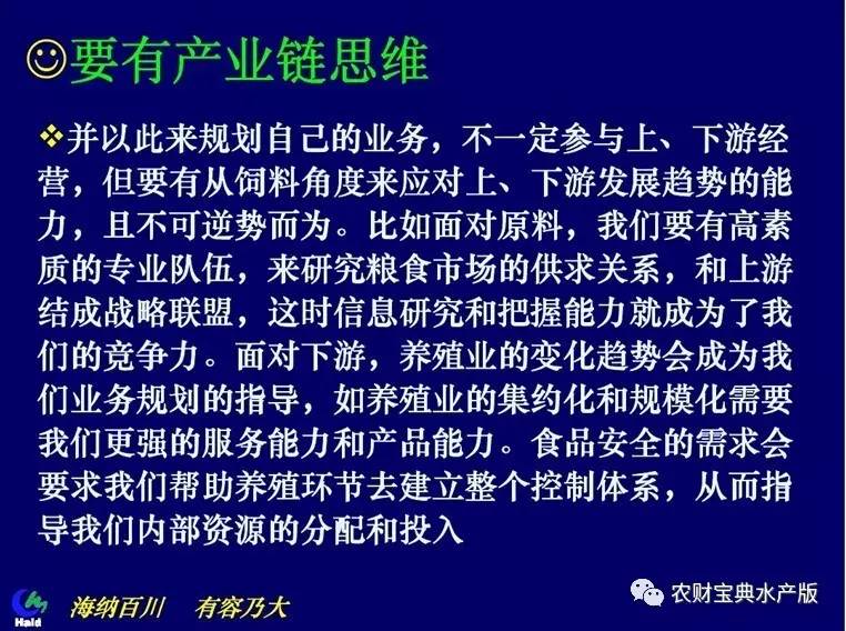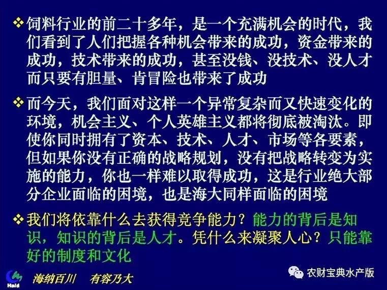 最近,小编整理资料,无意发现了海大集团董事长薛华十年前的一个PPT——《打造饲料企业核心竞争力》,这个PPT分析可以说是饲料企业发展的一份战略性纲领,也是海大集团系统变革的理论支撑,既有广度又有深度,当初的很多预判几乎都在今天一一变成现实,非常透彻地阐述了产业链整合过程中饲料企业该如何发展以及企业如何参与产业链的整合过程,在这些动态整合发展的过程中需要注意什么和拥有哪些要点,都把准了行业发展的脉搏。