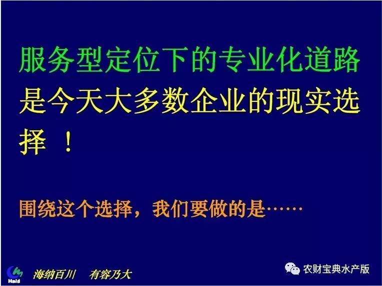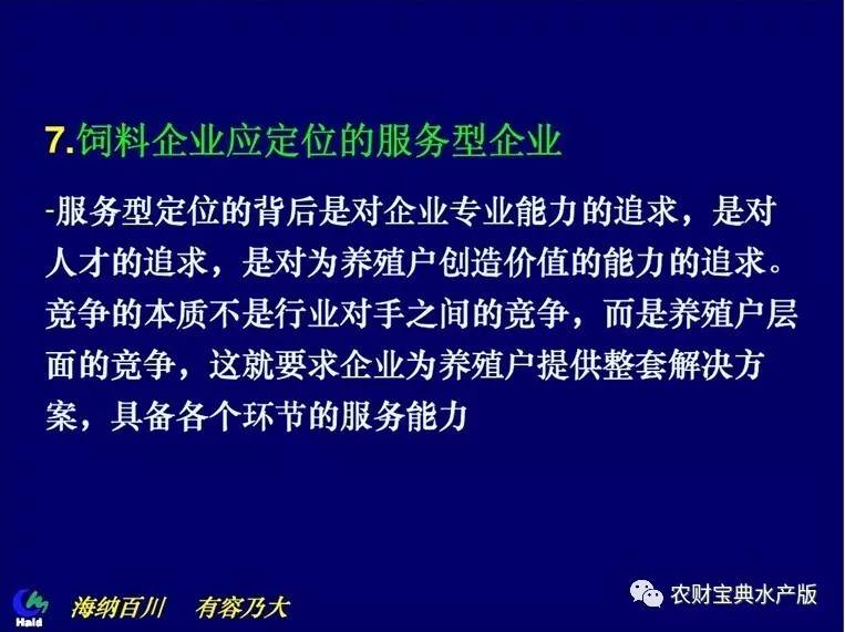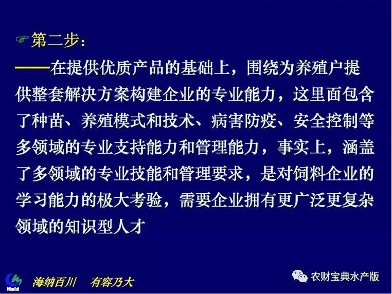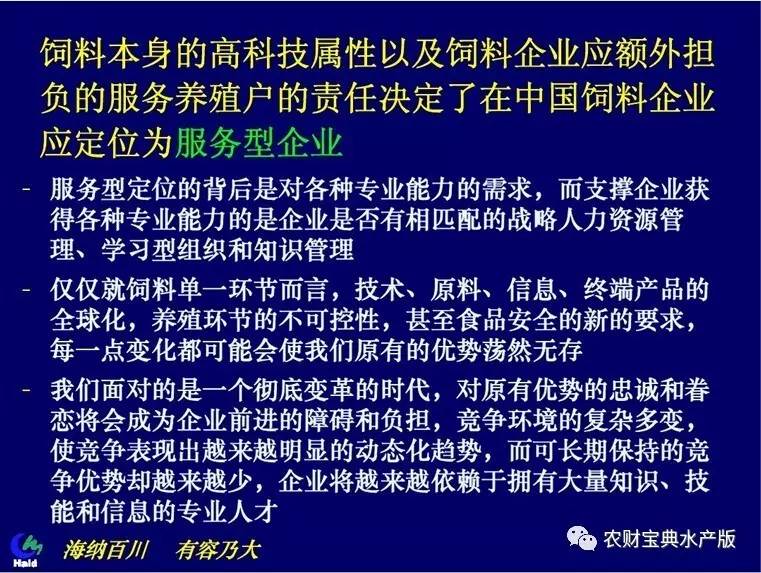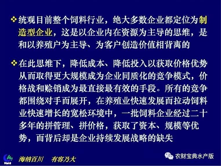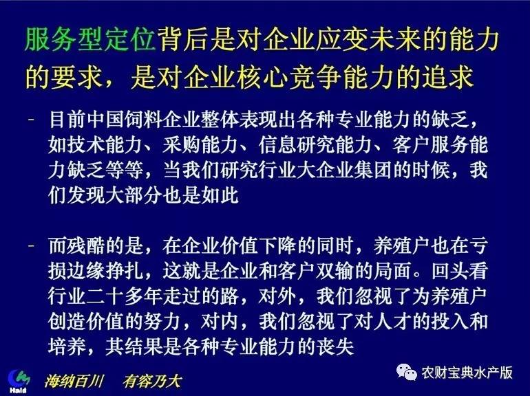 作为知识分子创业的一代,薛华在这份PPT里面充分展示了自己扎实的专业功底、高度的市场感敏性和高瞻远瞩的战略思想,他站在整个农牧行业大格局和养殖业发展进程的大视野中,系统性分析饲料产业的前世今生,动态的总结了饲料企业不同发展阶段的需求,清晰地指出饲料企业定位和未来发展方向,并率先提出饲料企业从制造业向服务型企业定位转型。
