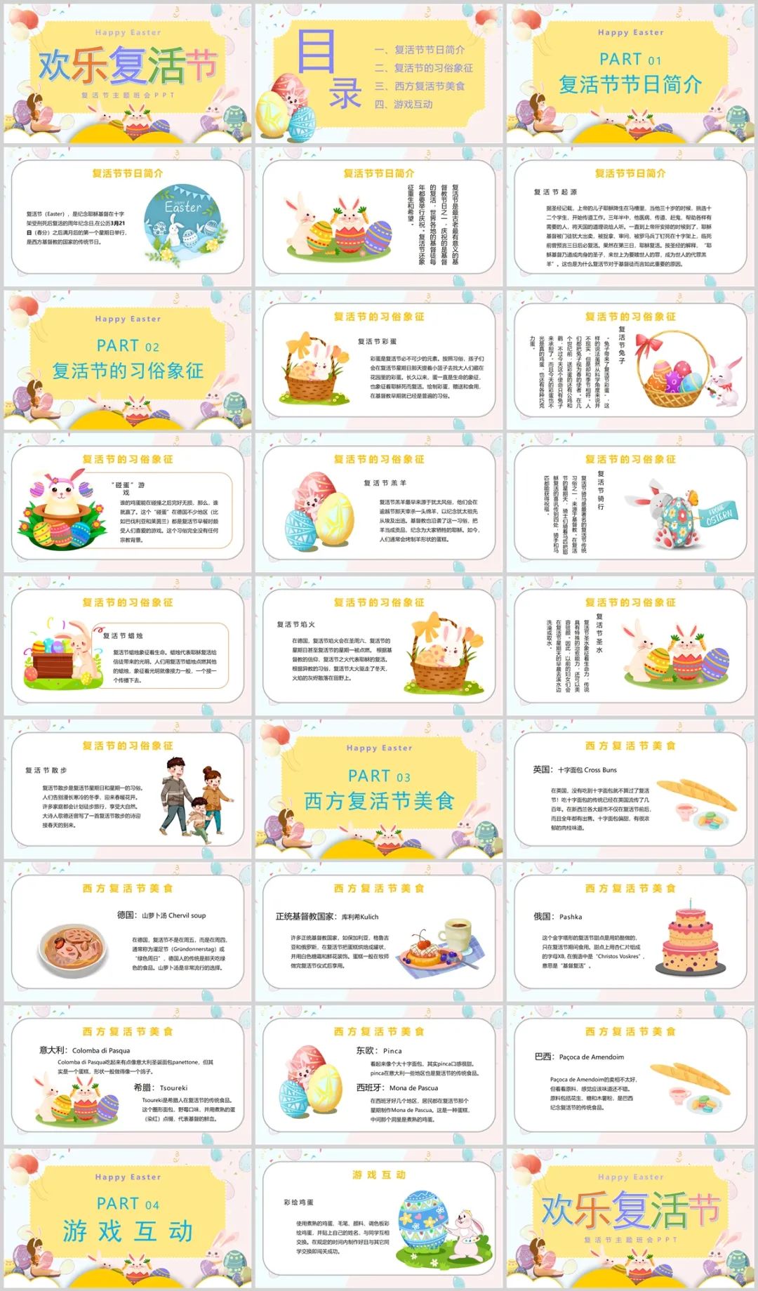 8.部分PPT模板示例如下:Happy Easter——复活节ppt模板复活节PPT模板欢乐复活节PPT模板4套复活节主题PPT模板,免费下载方法如下:步骤1:在文章底部右下角点个赞步骤2:关注本头条账号,私信回复信息"复活节"