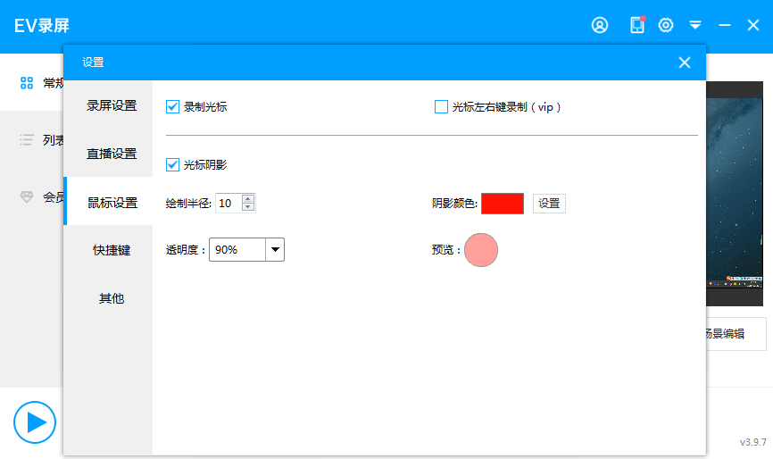 EV录屏有一个我特别喜欢的功能,提供鼠标运行轨迹的录制,在设置里可以进行我们自己喜欢的数值调整,之后录制的时候,我们就可以看到一个明显的鼠标运行轨迹了,特别适合教程的录制。