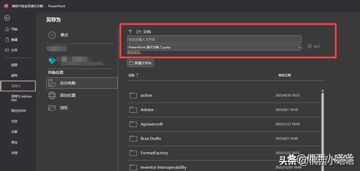 2.方法一、另存为快捷键1、另存为的快捷键是F12,怎么样?比储存的快捷键ctrl+S还简单吧?简单就快点用起来!2、点击F12,会弹出下图样式的另存为窗口,选择文件另保存的位置、格式和修改PPT名称,点击右下角保存即可